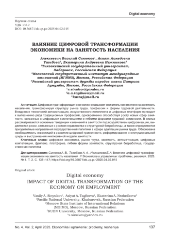 СИНЮКОВ В. А., ТАГИБОВА А. А., НЕЖНИКОВА Е. А. ВЛИЯНИЕ ЦИФРОВОЙ ТРАНСФОРМАЦИИ ЭКОНОМИКИ НА ЗАНЯТОСТЬ НАСЕЛЕНИЯ // ЭКОНОМИКА И УПРАВЛЕНИЕ: ПРОБЛЕМЫ, РЕШЕНИЯ. 2025. ТОМ 2 № 4