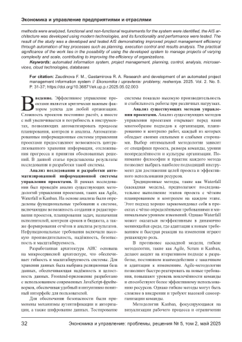 Данная статья посвящена исследованию и разработке автоматизированной информационной системы (АИС) управления проектами. Целью исследования является создание системы, позволяющей эффективно управлять проектами, контролировать сроки, бюджет и ресурсы. В рамках работы были проанализированы существующие методы управления проектами, определены функциональные и нефункциональные требования к системе, разработана архитектура АИС с использованием современных технологий и проведено тестирование ее функциональности и производительности. Результатом исследования стала разработанная и протестированная АИС, демонстрирующая повышение эффективности управления проектами за счет автоматизации ключевых процессов, таких как планирование, контроль исполнения и анализ результатов. Практическая значимость работы заключается в возможности применения разработанной системы для управления проектами различной сложности и масштаба, способствуя повышению эффективности работы организаций.