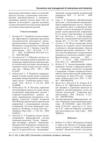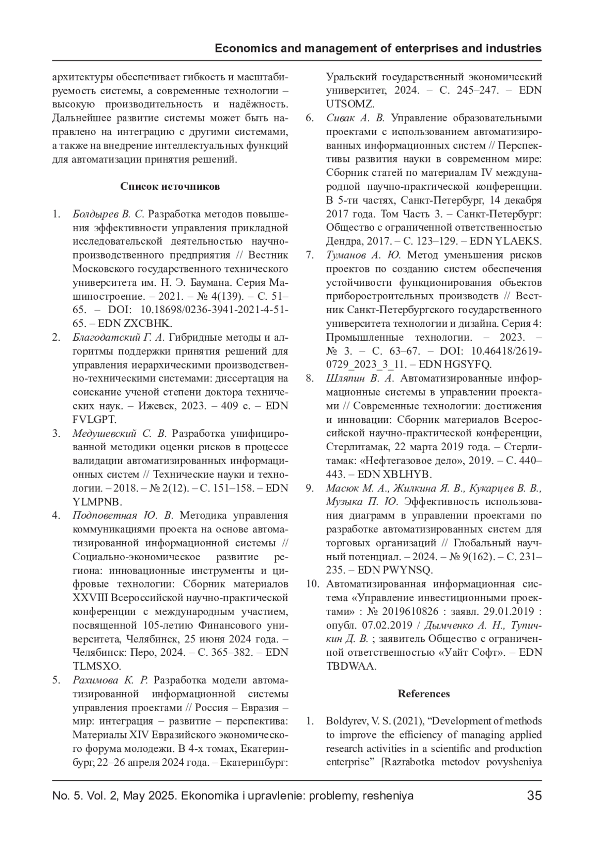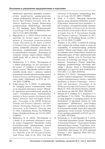 1. Болдырев В. С. Разработка методов повышения эффективности управления прикладной исследовательской деятельностью научно-производственного предприятия // Вестник Московского государственного технического университета им. Н. Э. Баумана. Серия Машиностроение. - 2021. - № 4(139). - С. 51- 65. -. DOI: 10.18698/0236-3941-2021-4-51-65 EDN: ZXCBHK