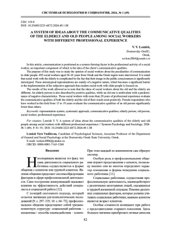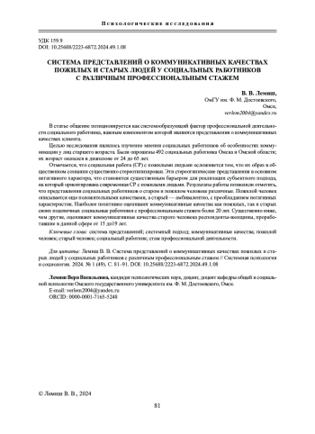 Отмечается, что социальная работа (СР) с пожилыми людьми осложняется тем, что их образ в общественном сознании существенно стереотипизирован. Эти стереотипические представления в основном негативного характера, что становится существенным барьером для реализации субъектного подхода, на который ориентирована современная СР с пожилыми людьми. Результаты работы позволили отметить, что представления социальных работников о старом и пожилом человеке различные. Пожилой человек описывается еще положительными качествами, а старый - амбивалентно, с преобладанием негативных характеристик. Наиболее позитивно оценивают коммуникативные качества как пожилых, так и старых своих подопечных социальные работники с профессиональным стажем более 20 лет. Существенно ниже, чем другие, оценивают коммуникативные качества старого человека респонденты-женщины, проработавшие в данной сфере от 15 до19 лет.