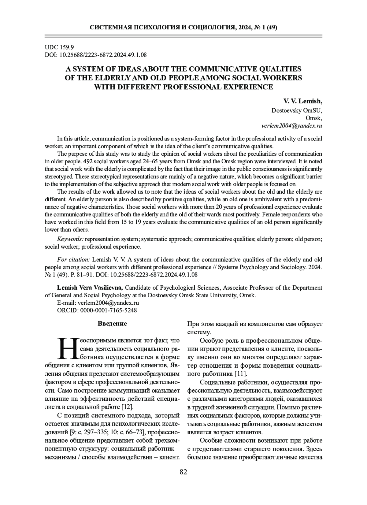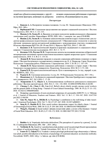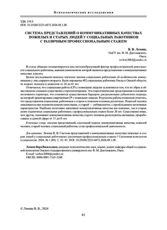 8. Лемиш В. В. Представления социальных работников о пожилых и старых людях // Вестник Тюменского государственного университета. Педагогика. Психология. 2014. № 9. С.173-180. EDN: TBVTNL