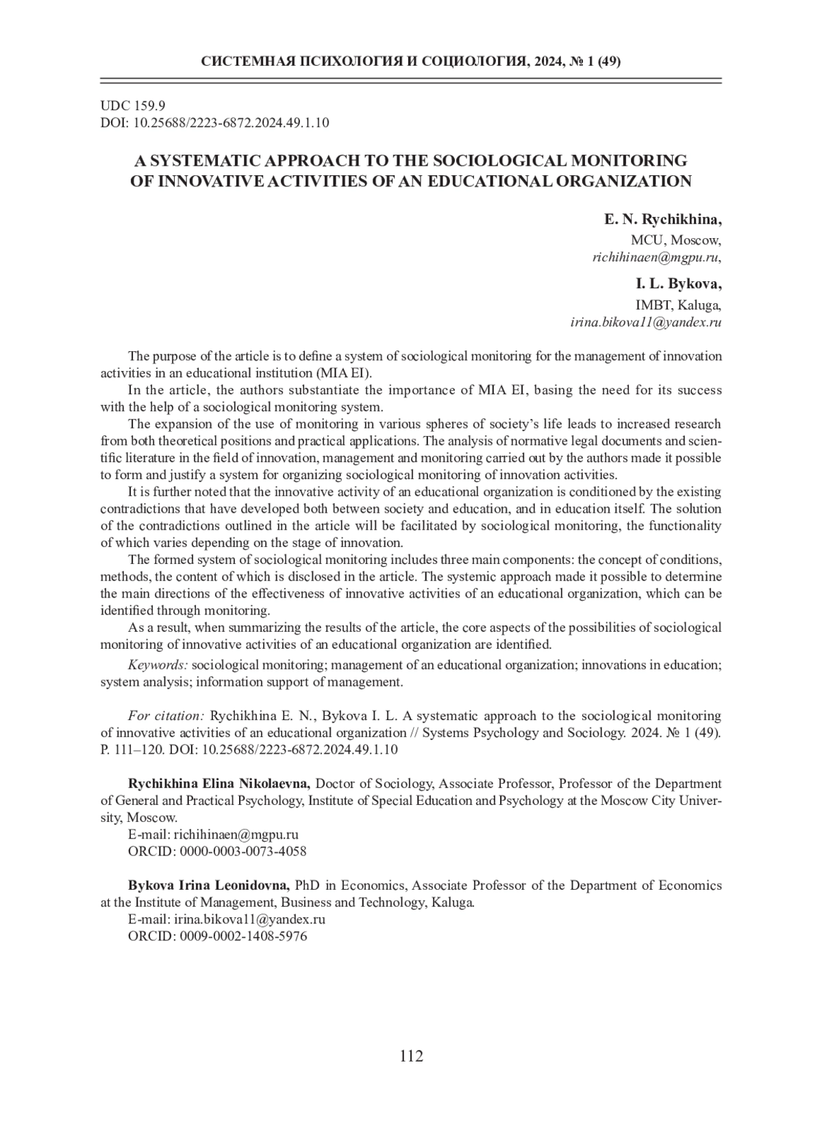 Целью статьи является определение системы социологического мониторинга для управления инновационной деятельностью в образовательном учреждении (УИД ОУ).