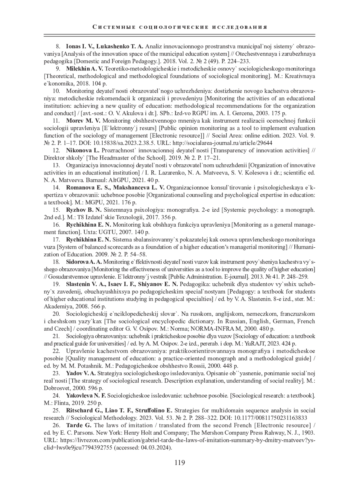 11. Морев М. В. Мониторинг общественного мнения как инструмент реализации оценочной функции социологии управления [Электронный ресурс] // Социальное пространство: сетевое издание. 2023. Т. 9. № 2. С. 1-17. 10.15838/sa.2023.2.38.5. URL: http://socialarea-journal.ru/article/29644. DOI: 10.15838/sa.2023.2.38.5.URL
