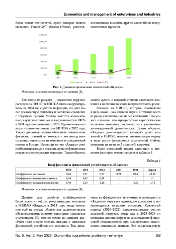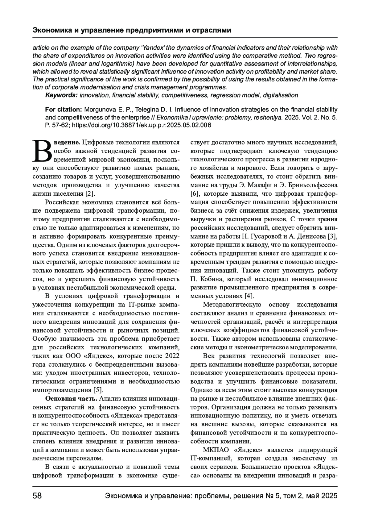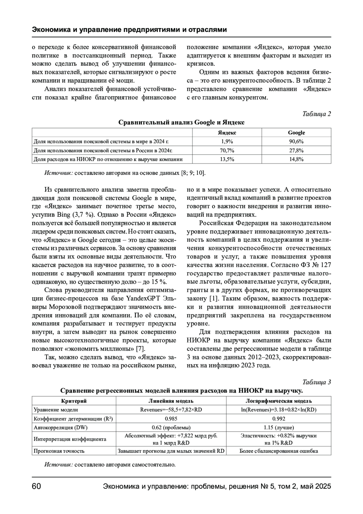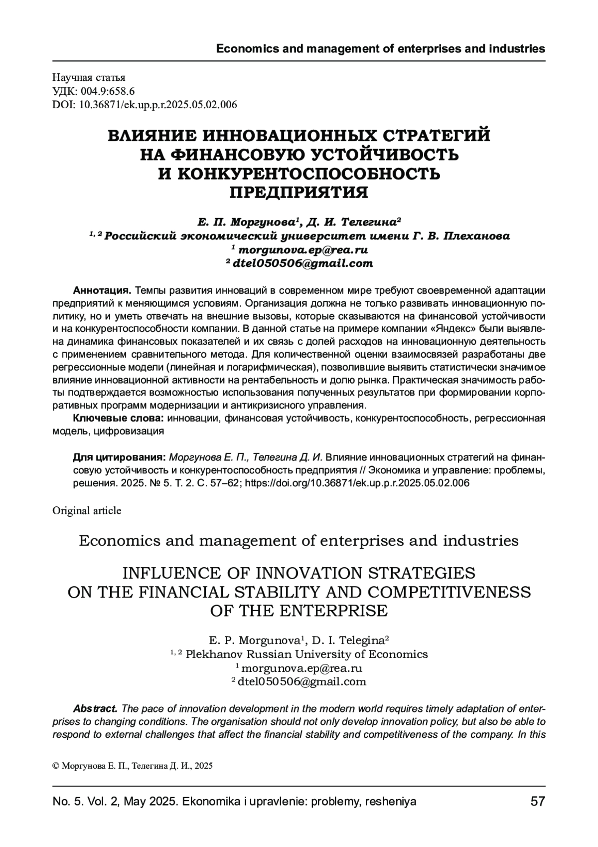 Темпы развития инноваций в современном мире требуют своевременной адаптации предприятий к меняющимся условиям. Организация должна не только развивать инновационную политику, но и уметь отвечать на внешние вызовы, которые сказываются на финансовой устойчивости и на конкурентоспособности компании. В данной статье на примере компании «Яндекс» были выявлена динамика финансовых показателей и их связь с долей расходов на инновационную деятельность с применением сравнительного метода. Для количественной оценки взаимосвязей разработаны две регрессионные модели (линейная и логарифмическая), позволившие выявить статистически значимое влияние инновационной активности на рентабельность и долю рынка. Практическая значимость работы подтверждается возможностью использования полученных результатов при формировании корпоративных программ модернизации и антикризисного управления.