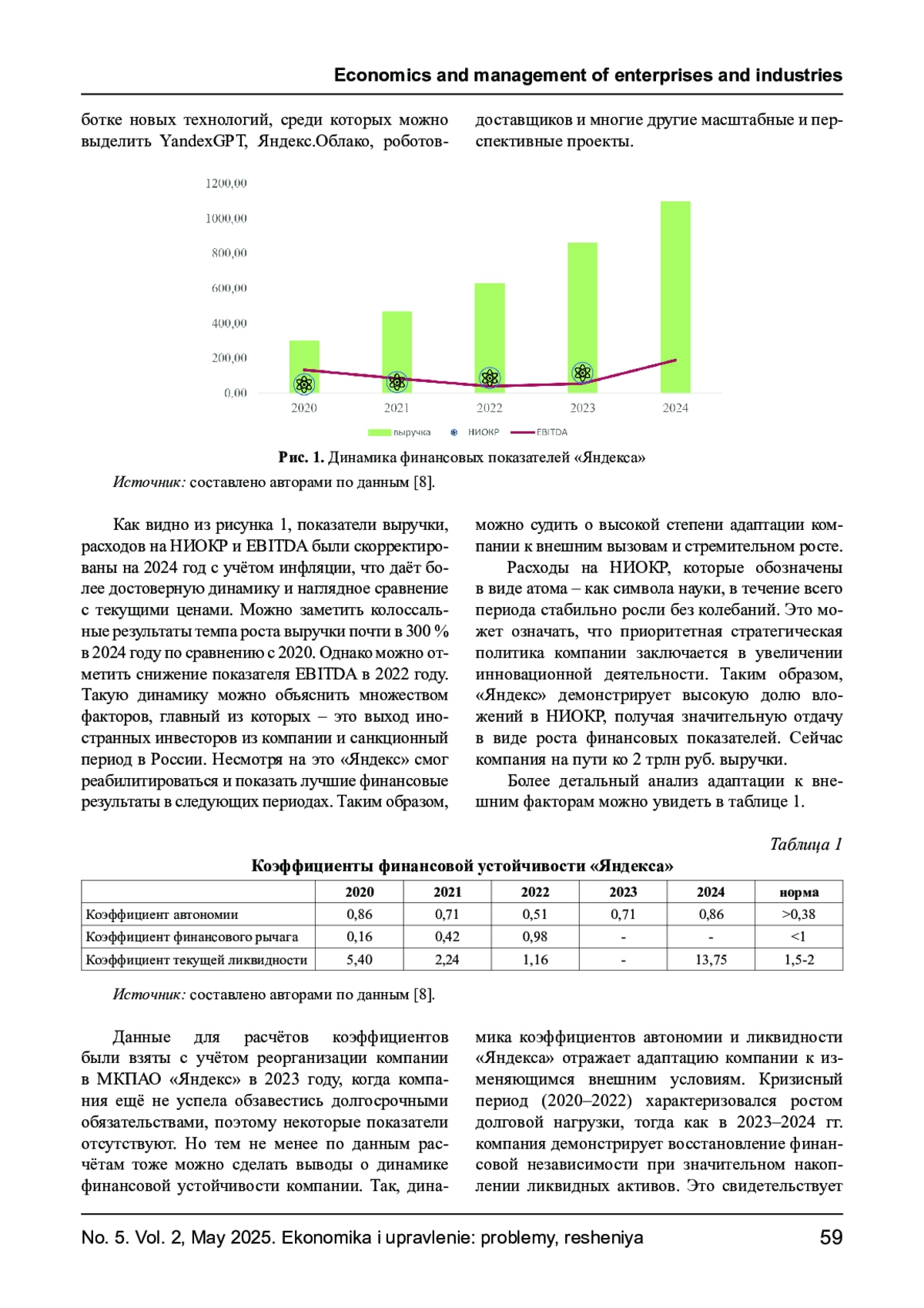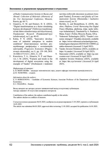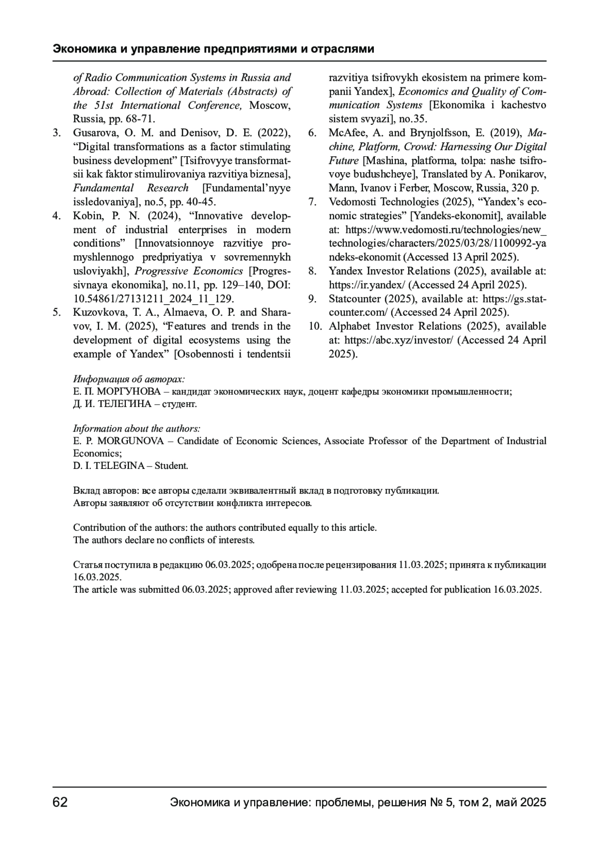 5. Кузовкова Т. А., Алмаева О. П., Шаравов И. М. Особенности и тенденции развития цифровых экосистем на примере компании Яндекс // Экономика и качество систем связи. - 2025. - № 35. EDN: THGALI