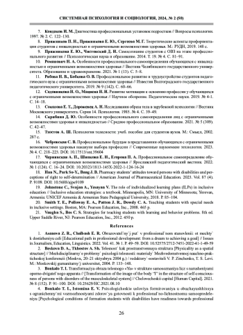 Ключевые фразы: профессиональные установки, профессиональный выбор, ПРОФЕССИОНАЛЬНО-ЛИЧНОСТНОЕ РАЗВИТИЕ, образ телесного я, обучающиеся с нарушениями опорно-двигательного аппарата