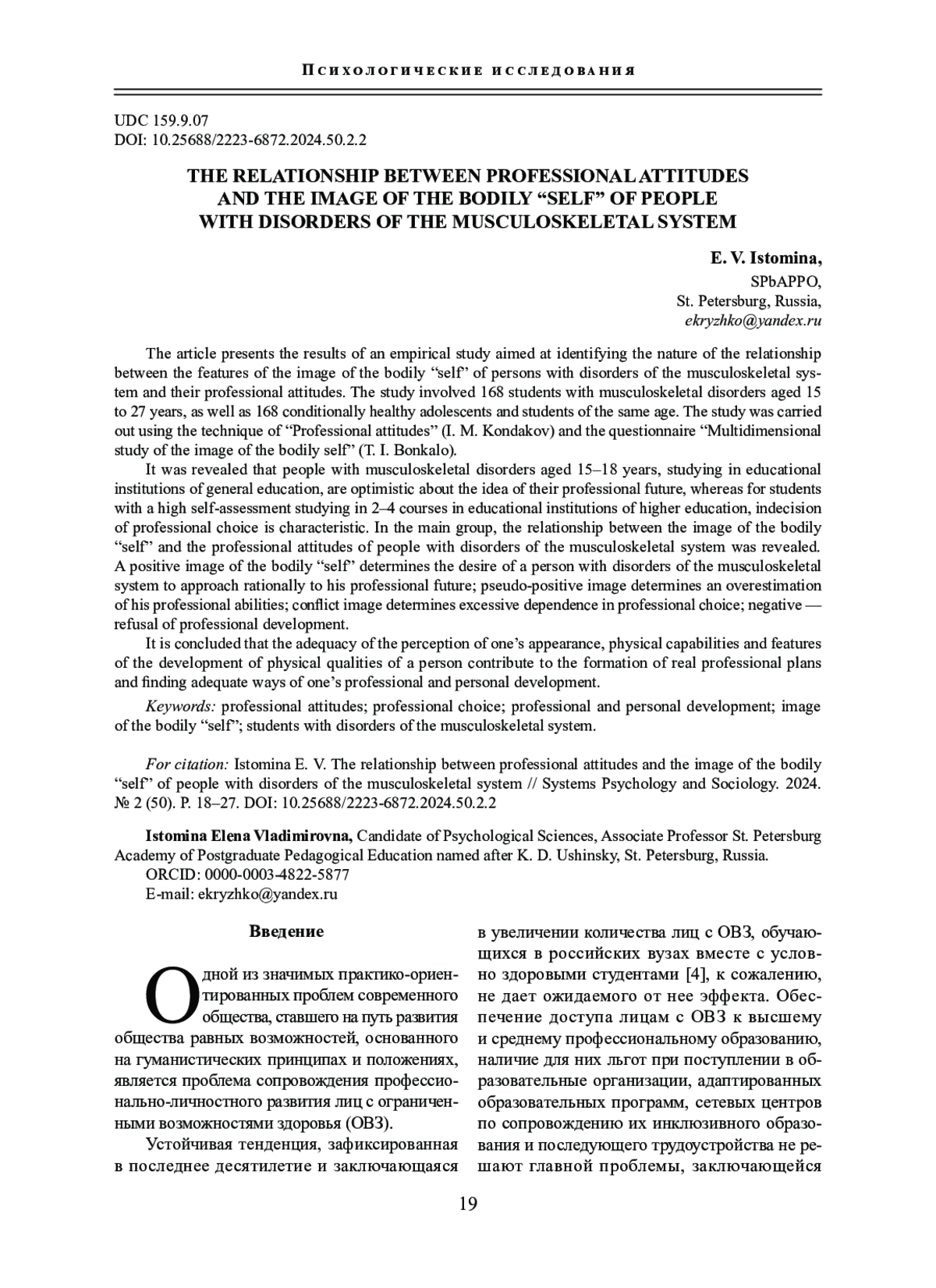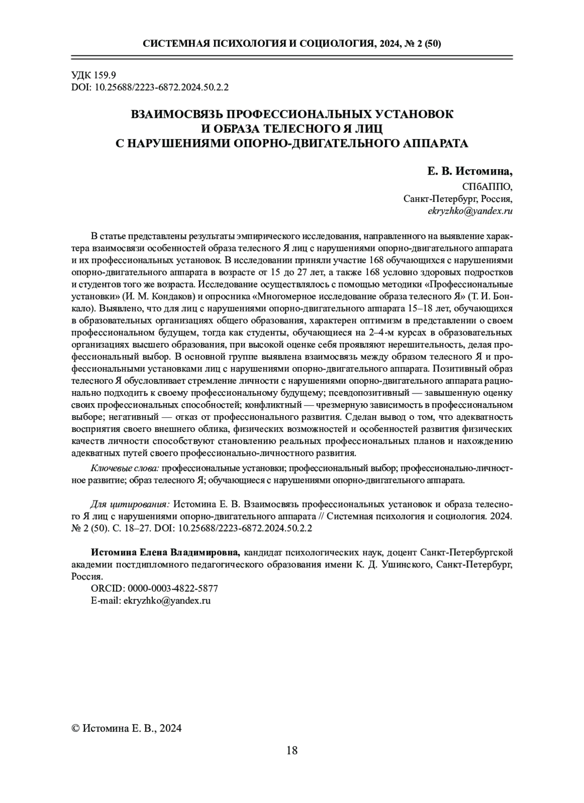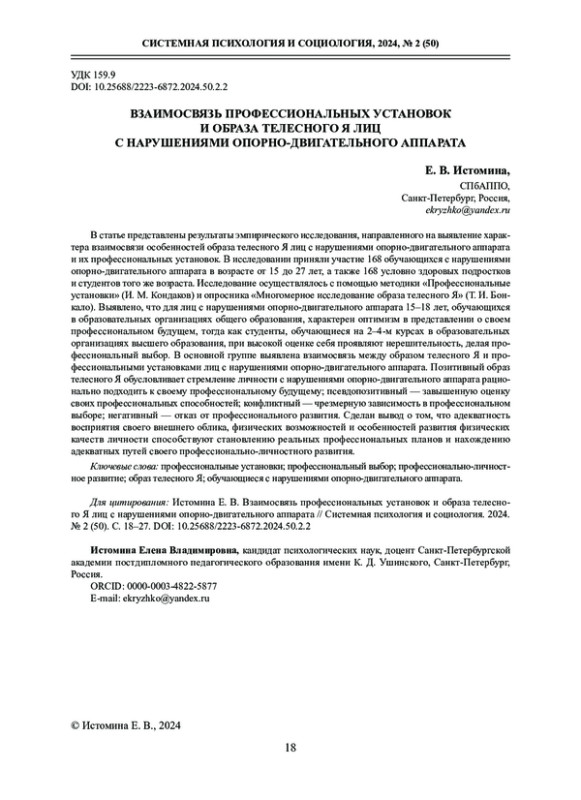 ИСТОМИНА Е. В. ВЗАИМОСВЯЗЬ ПРОФЕССИОНАЛЬНЫХ УСТАНОВОК И ОБРАЗА ТЕЛЕСНОГО Я ЛИЦ С НАРУШЕНИЯМИ ОПОРНО-ДВИГАТЕЛЬНОГО АППАРАТА // СИСТЕМНАЯ ПСИХОЛОГИЯ И СОЦИОЛОГИЯ. 2024. № 2 (50)