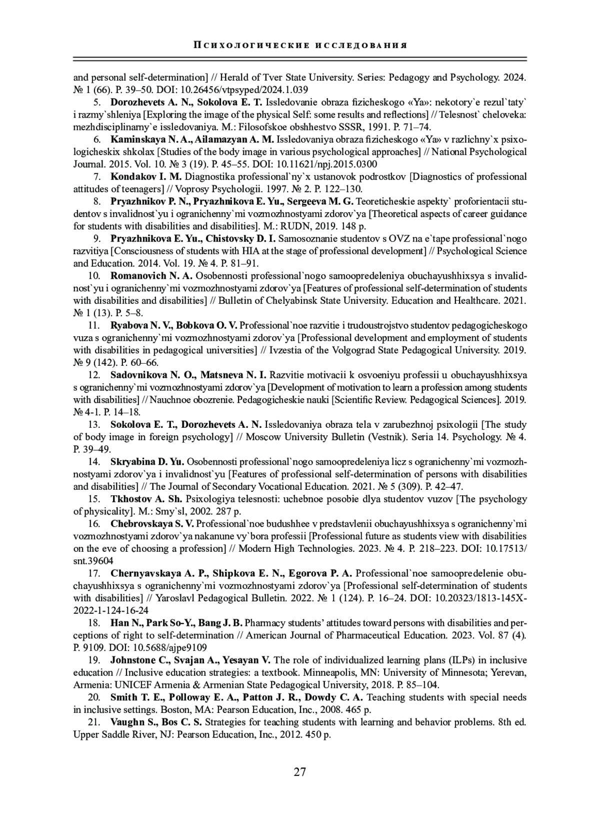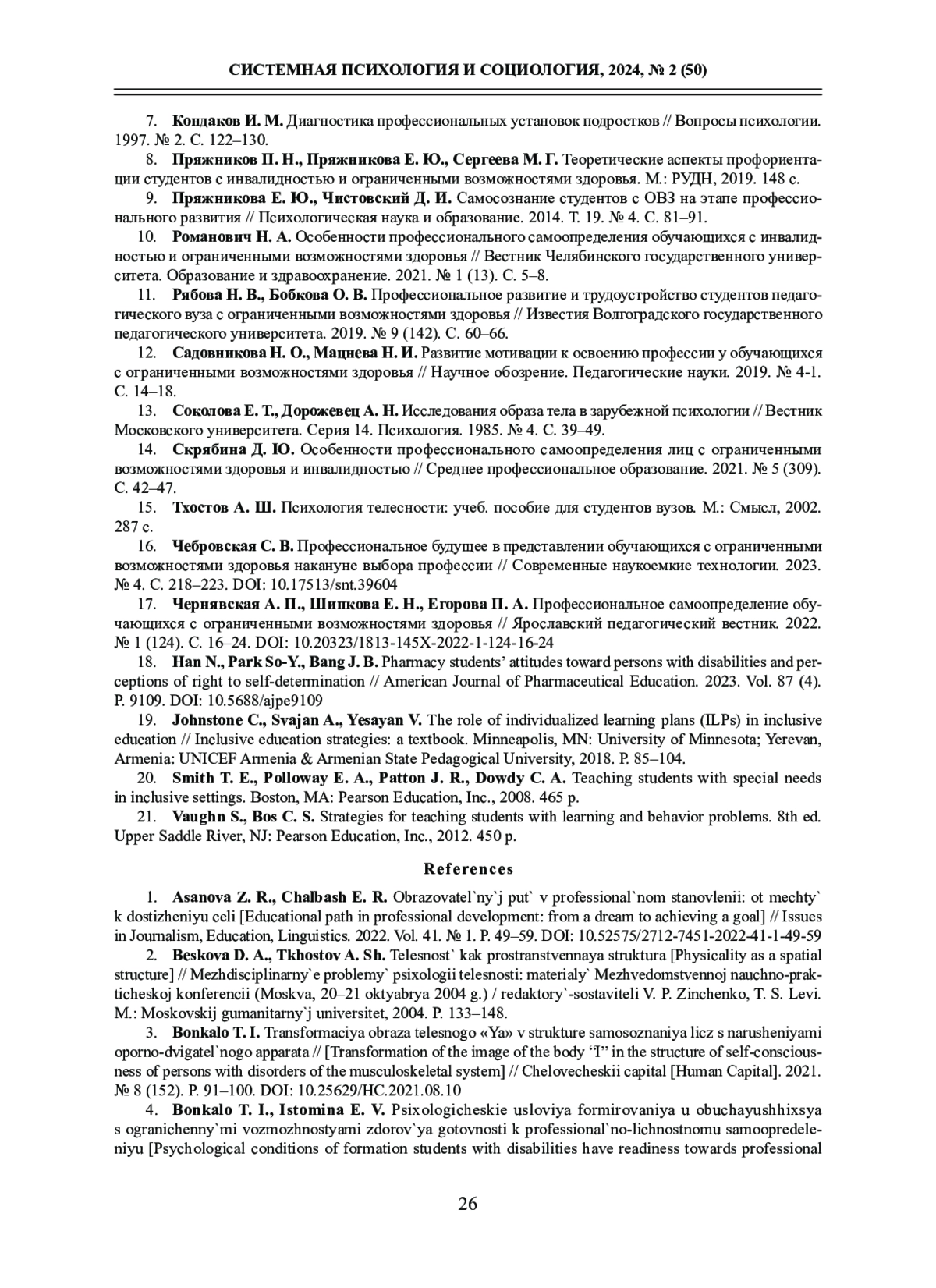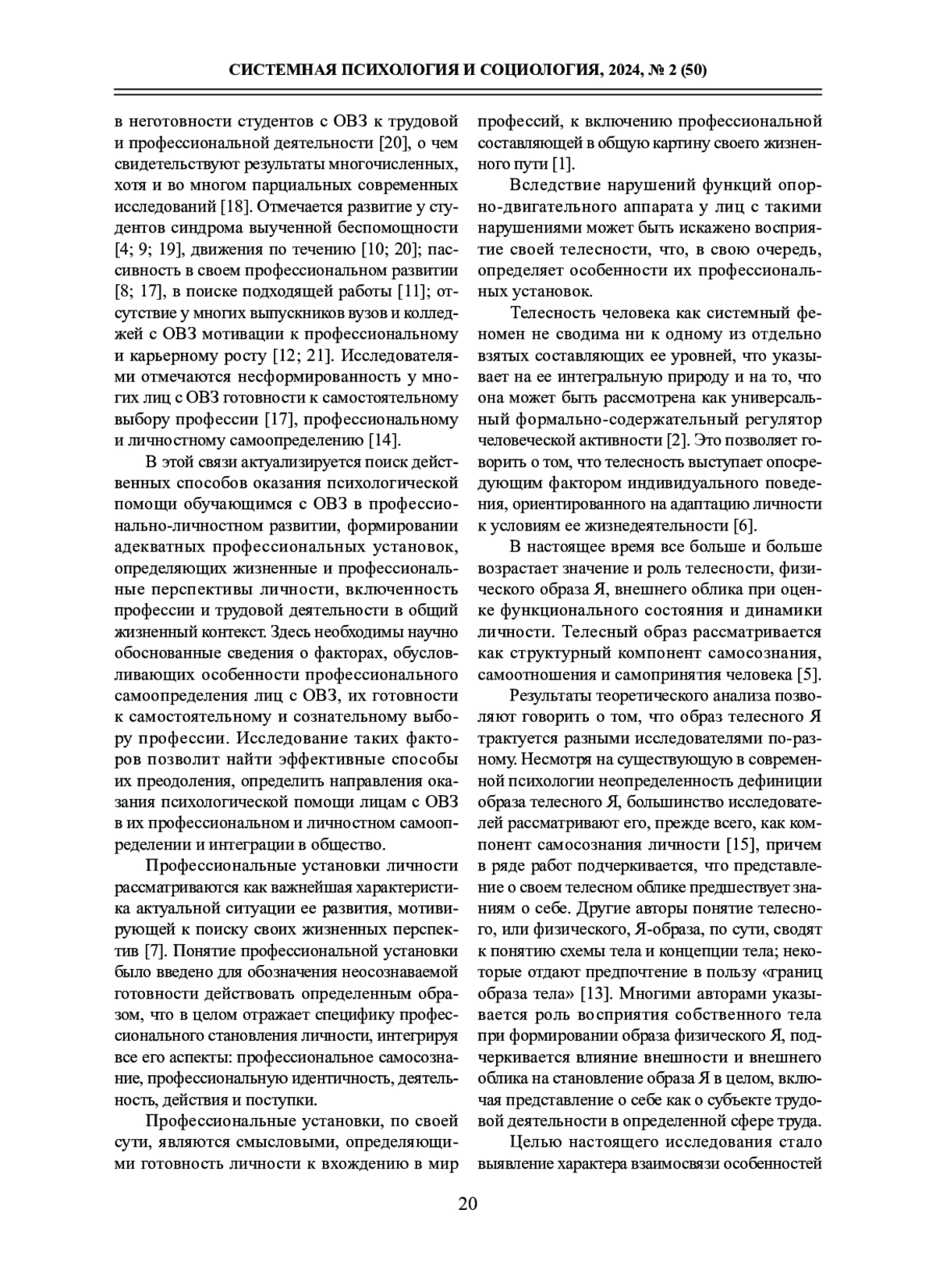 ИСТОМИНА Е. В. ВЗАИМОСВЯЗЬ ПРОФЕССИОНАЛЬНЫХ УСТАНОВОК И ОБРАЗА ТЕЛЕСНОГО Я ЛИЦ С НАРУШЕНИЯМИ ОПОРНО-ДВИГАТЕЛЬНОГО АППАРАТА // СИСТЕМНАЯ ПСИХОЛОГИЯ И СОЦИОЛОГИЯ. 2024. № 2 (50)