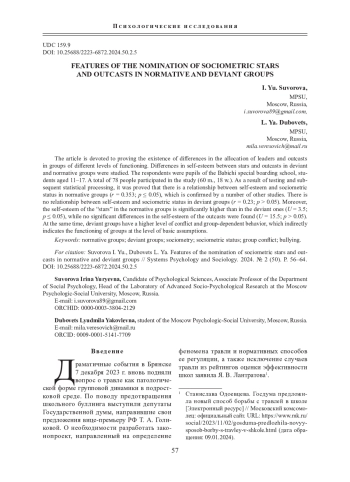 Статья посвящена доказательству существования различий в выделении лидеров и изгоев в группах разного уровня функционирования. Исследовались различия в самооценке у звезд и изгоев в девиантных и нормативных группах. Респондентами выступили воспитанники Бабичской специальной школы-интерната, обучающиеся 11-17 лет. Всего в исследовании приняли участие 78 человек (60 мальчиков, 18 девочек). В результате тестирования и последующей статистической обработки было доказано, что существует взаимосвязь между самооценкой и социометрическим статусом в нормативных группах ( r = 0,353; p ≤ 0,05), что подтверждается рядом других исследований. Взаимосвязь между самооценкой и социометрическим статусом в девиантных группах отсутствует ( r = 0,23; p > 0,05). Более того, самооценк а звезд в нормативных группах достоверно выше, чем в девиантных ( U = 3,5; p ≤ 0,05), тогда как существенных различий в самооценке изгоев не обнаружено ( U = 15,5; p > 0,05). Вместе с тем в девиантных группах выше уровень конфликтности и зависимого от группы поведения, что косвенно указывает на функционирование групп на уровне базовых допущений.