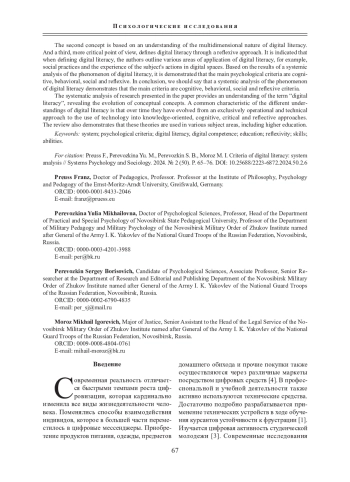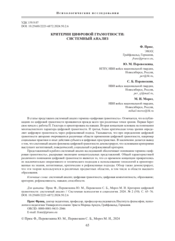 И третья, более критическая точка зрения определяет цифровую грамотность через рефлексивный подход. Указывается, что при определении цифровой грамотности авторами очерчиваются различные области применения цифровой грамотности, например социальные практики и опыт действия субъекта в цифровых пространствах. В заключение делается вывод о том, что системный анализ феномена цифровой грамотности демонстрирует, что основными критериями выступают когнитивный, поведенческий, социальный и рефлексивный критерии.