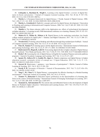 20. Littlejohn A., Beetham H., Mcgill L. Learning at the digital frontier: a review of digital literacies in theory and practice // Journal of Computer Assisted Learning. 2012. Vol. 28 (6). P. 547-556. DOI: 10.1111/j.1365-2729.2011.00474.x