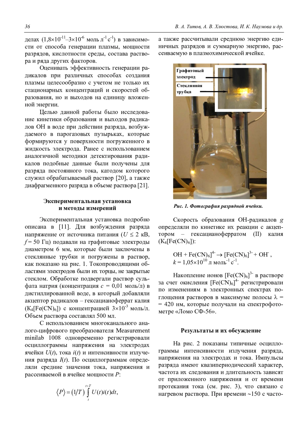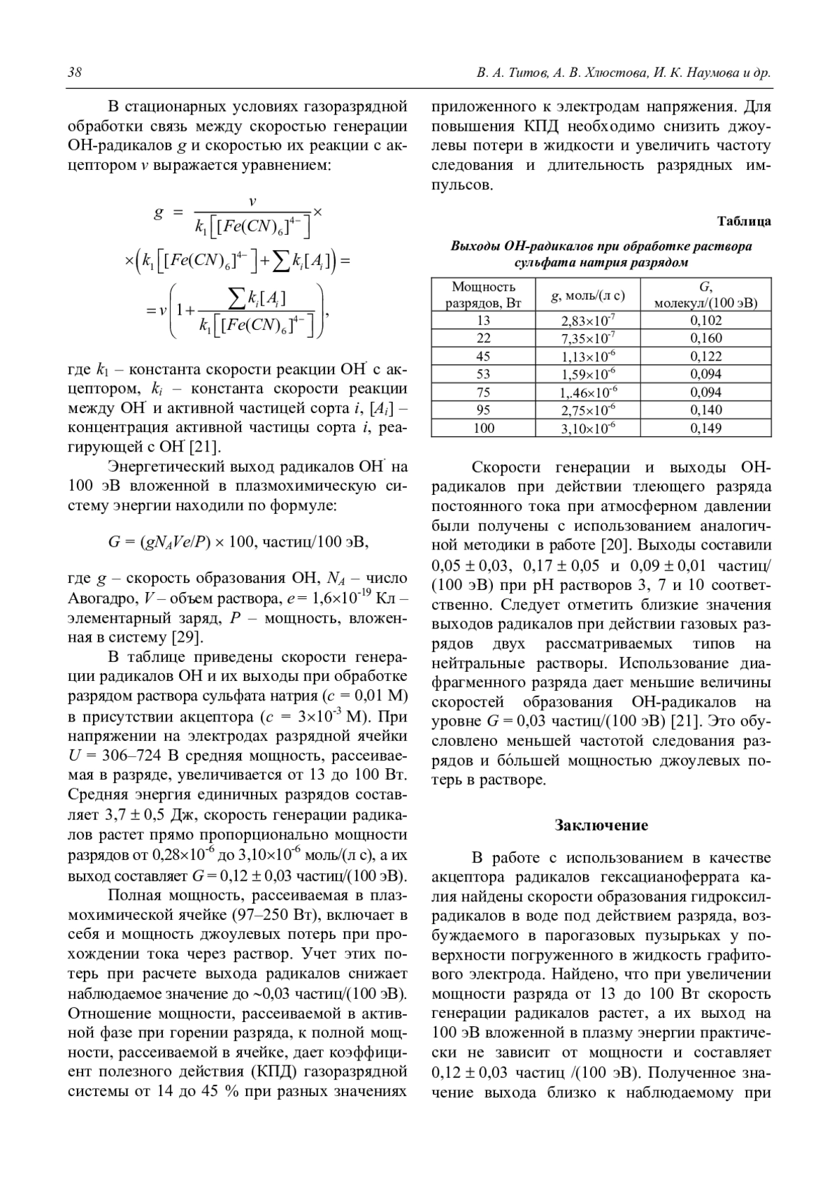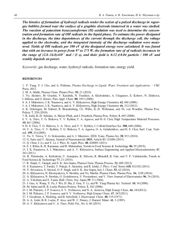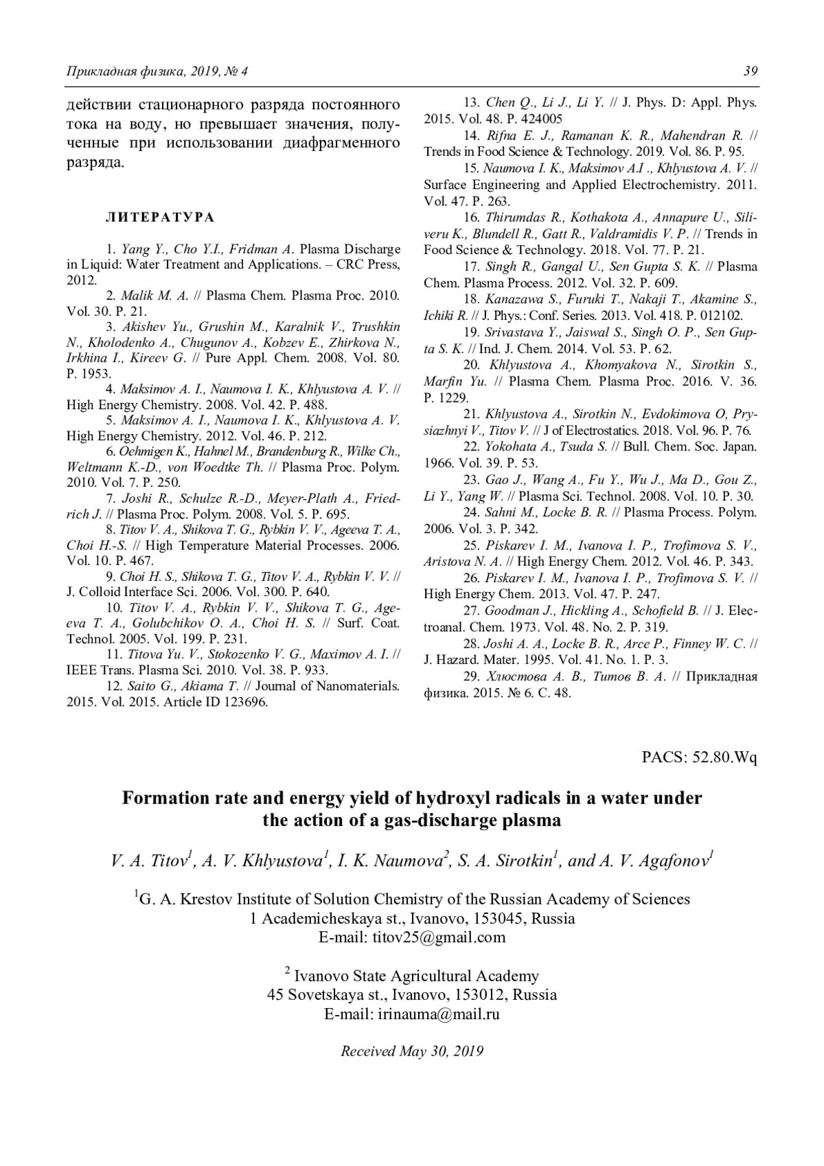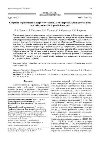 ТИТОВ В. А., ХЛЮСТОВА А. В., НАУМОВА И. К., СИРОТКИН Н. А., АГАФОНОВ А. В. СКОРОСТЬ ОБРАЗОВАНИЯ И ЭНЕРГЕТИЧЕСКИЙ ВЫХОД ГИДРОКСИЛ-РАДИКАЛОВ В ВОДЕ ПРИ ДЕЙСТВИИ ГАЗОРАЗРЯДНОЙ ПЛАЗМЫ // ПРИКЛАДНАЯ ФИЗИКА. 2019. №4