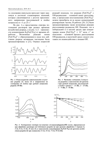 Исследована кинетика образования гидроксил-радикалов в воде под действием импульсного разряда в парогазовых пузырьках, формирующихся у поверхности погруженного в воду графитового электрода. Реакция окисления гексацианоферрата (II) калия использовалась для определения концентрации и скорости образования ОН-радикалов в жидкой фазе. Для оценки мощности, рассеиваемой в разряде, измерены временные зависимости тока, протекающего через разрядную ячейку, напряжения, приложенного к электродам, и интегральной интенсивности излучения разряда. Рассчитаны выходы ОН-радикалов на 100 эВ вложенной в плазму энергии. Найдено, что с увеличением мощности от 13 до 100 Вт скорость генерации радикалов растет в интервале (2,8–34,8)10-7 моль/(л с), а их выход слабо зависит от мощности и составляет 0,12  0,03 частица / (100 эВ).