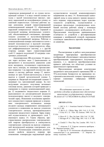 Рассмотренные в работе неохлаждаемые матричные терагерцовые преобразователи изображений обеспечивают непосредственное преобразоваание терагерцового излучения в видимое, т. е. являются преобразователями прямого действия, что облегчает условия их практического применения.