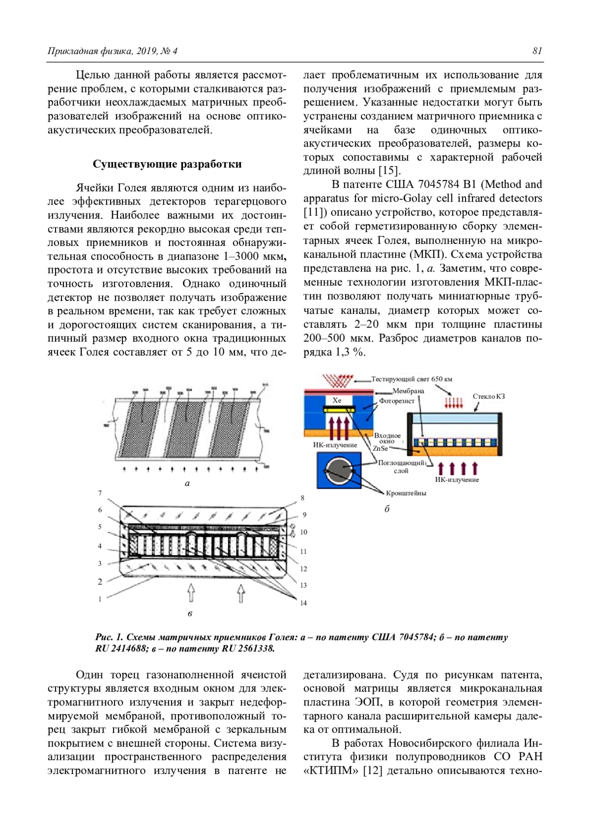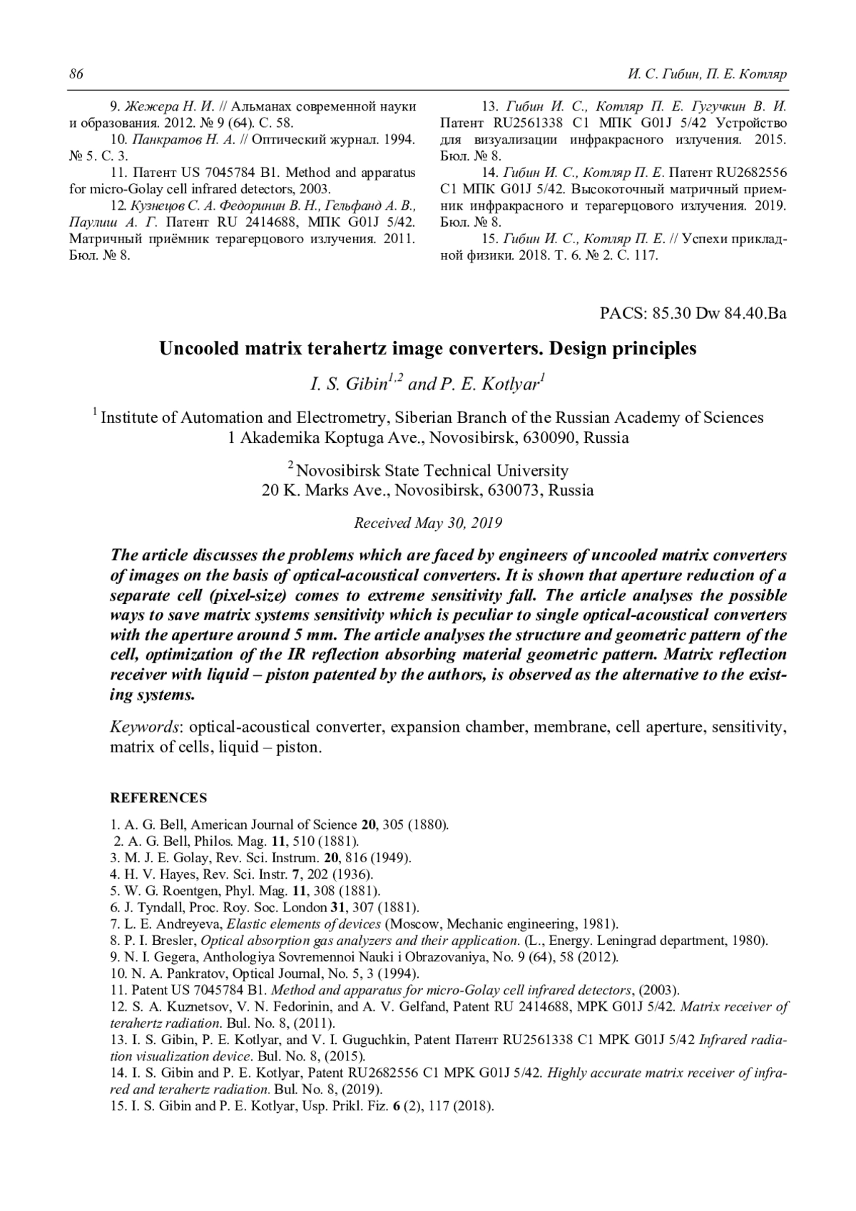 14. I. S. Gibin and P. E. Kotlyar, Patent RU2682556 С1 МPK G01J 5/42. Highly accurate matrix receiver of infrared and terahertz radiation. Bul. No. 8, (2019).