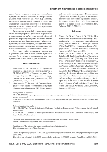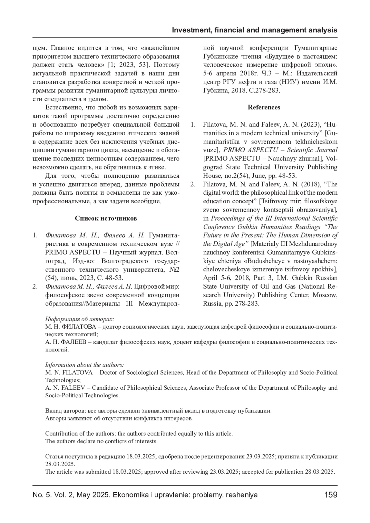 1. Филатова М. Н., Фалеев А. Н. Гуманитаристика в современном техническом вузе // PRIMO ASPECTU - Научный журнал. Волгоград, Изд-во: Волгоградского государственного технического университета, №2 (54), июнь, 2023, С. 48-53.