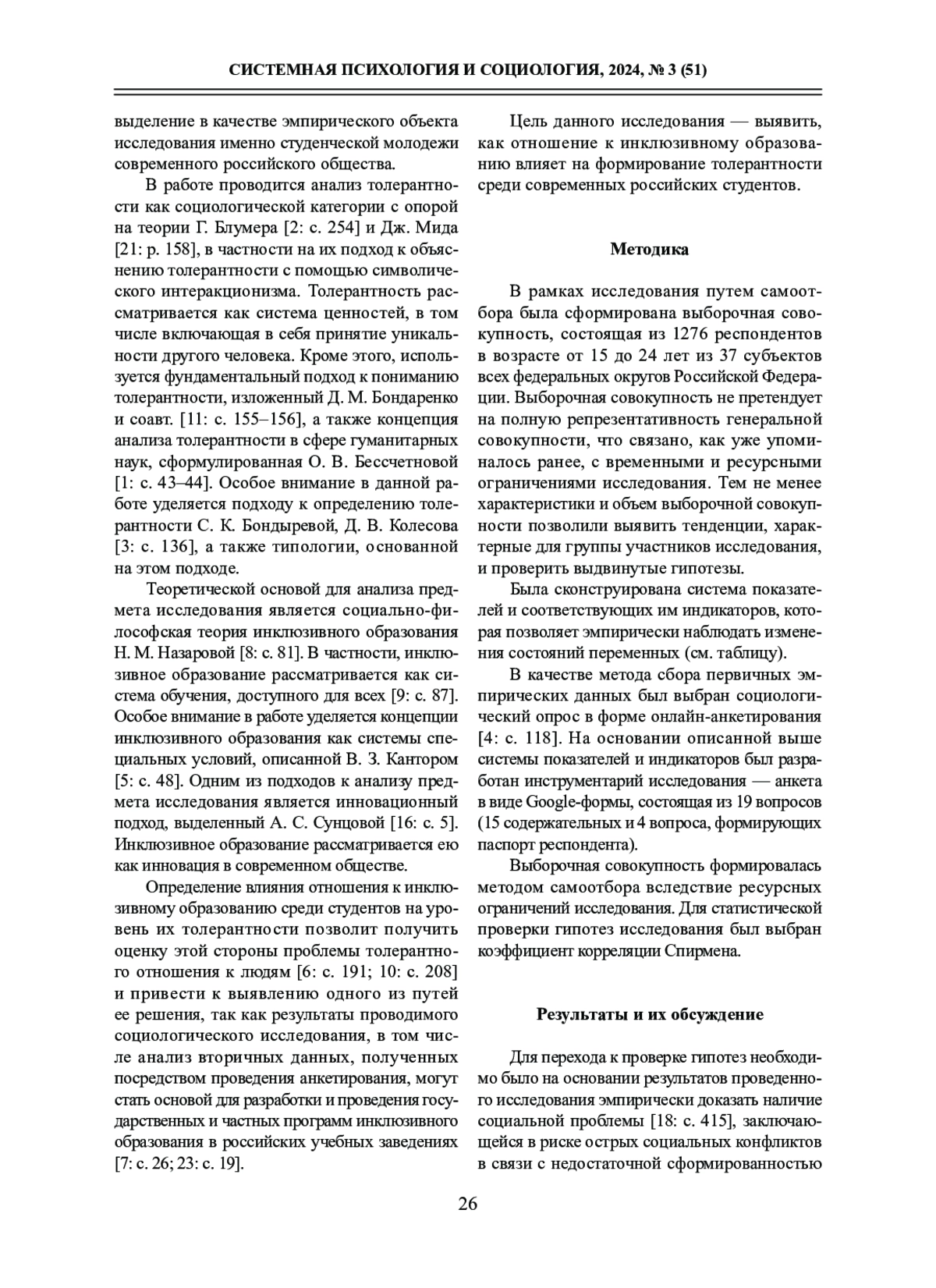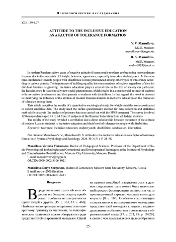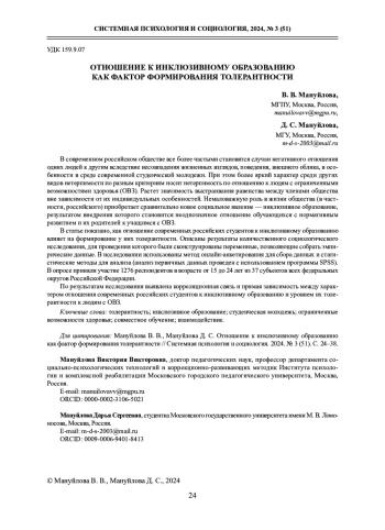 В статье показано, как отношение современных российских студентов к инклюзивному образованию влияет на формирование у них толерантности. Описаны результаты количественного социологического исследования, для проведения которого были сконструированы переменные, позволяющие собрать эмпирические данные. В исследовании использованы метод онлайн-анкетирования для сбора данных и статистические методы для анализа (анализ первичных данных проведен с использованием программы SPSS). В опросе приняли участие 1276 респондентов в возрасте от 15 до 24 лет из 37 субъектов всех федеральных округов Российской Федерации.