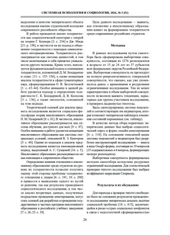 В среде нынешнего российского общества все большую остроту приобретает проблема нетолерантности одних людей к другим [15: с. 363; 13: с. 460]. Наиболее часто примеры нетерпимости по конкретному признаку (в частности, по психофизическим отличиям) можно обнаружить среди представителей современной молодежи. Одной из причин подобной напряженности в данном социальном слое может быть интенсивный процесс формирования личности и часто противоречивый характер человека в молодом возрасте [8: с. 106].