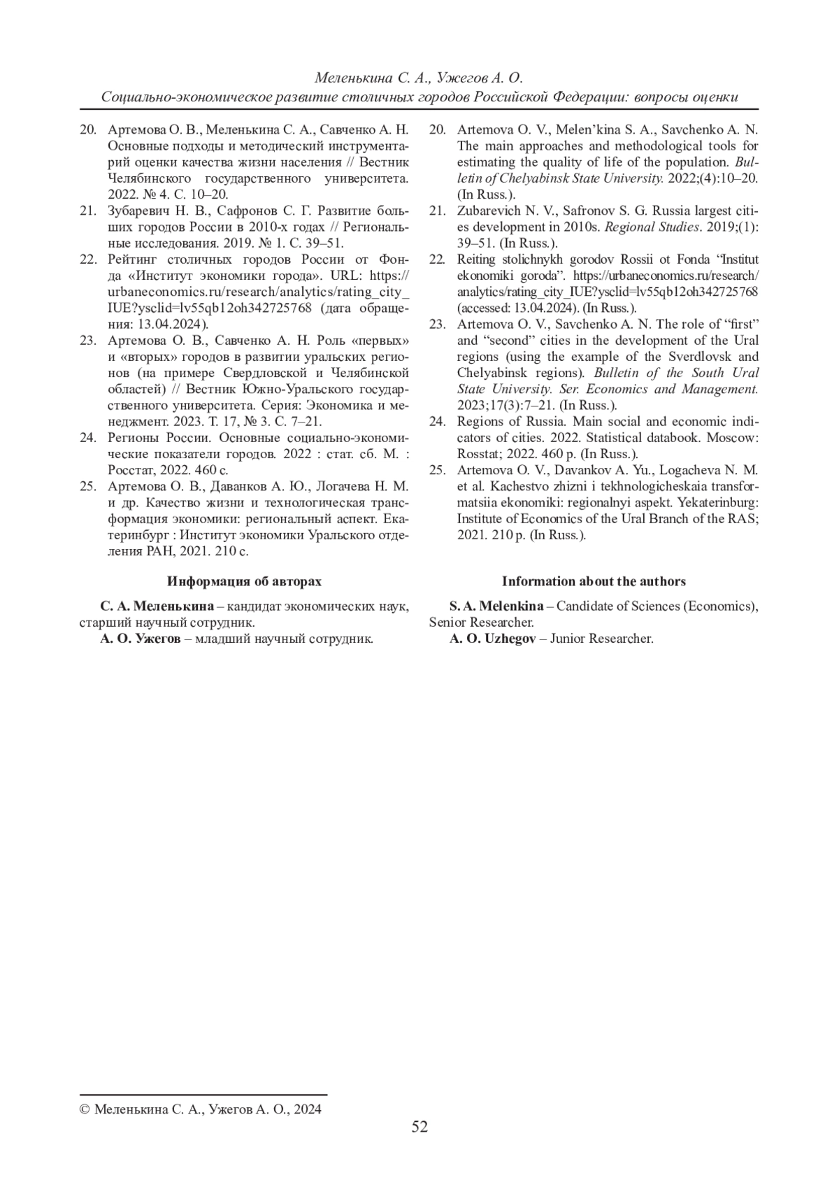 23. Артемова О. В., Савченко А. Н. Роль «первых» и «вторых» городов в развитии уральских регионов ( на примере Свердловской и Челябинской областей) // Вестник Южно-Уральского государственного университета. Серия: Экономика и менеджмент. 2023. Т. 17, № 3. С. 7-21.