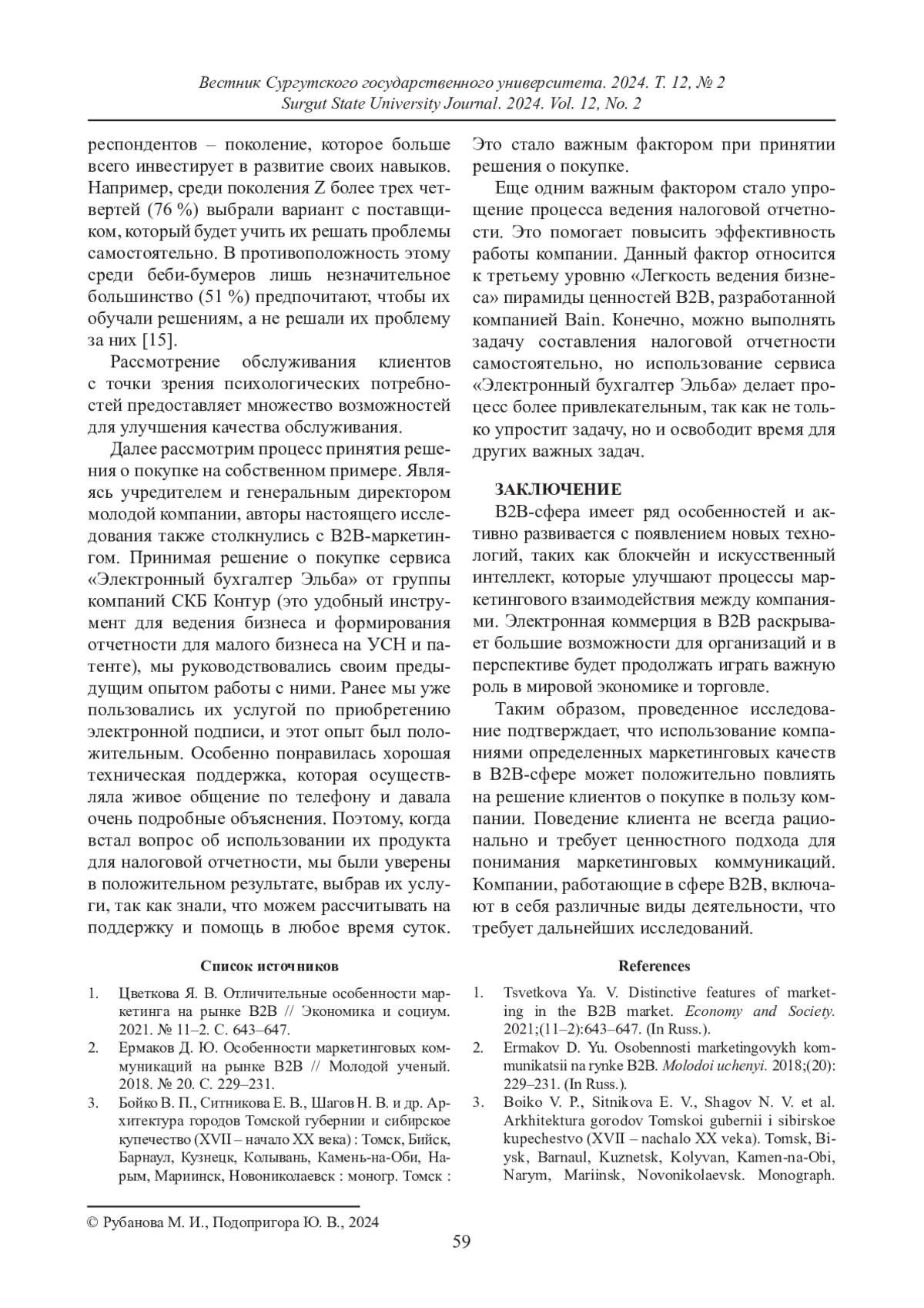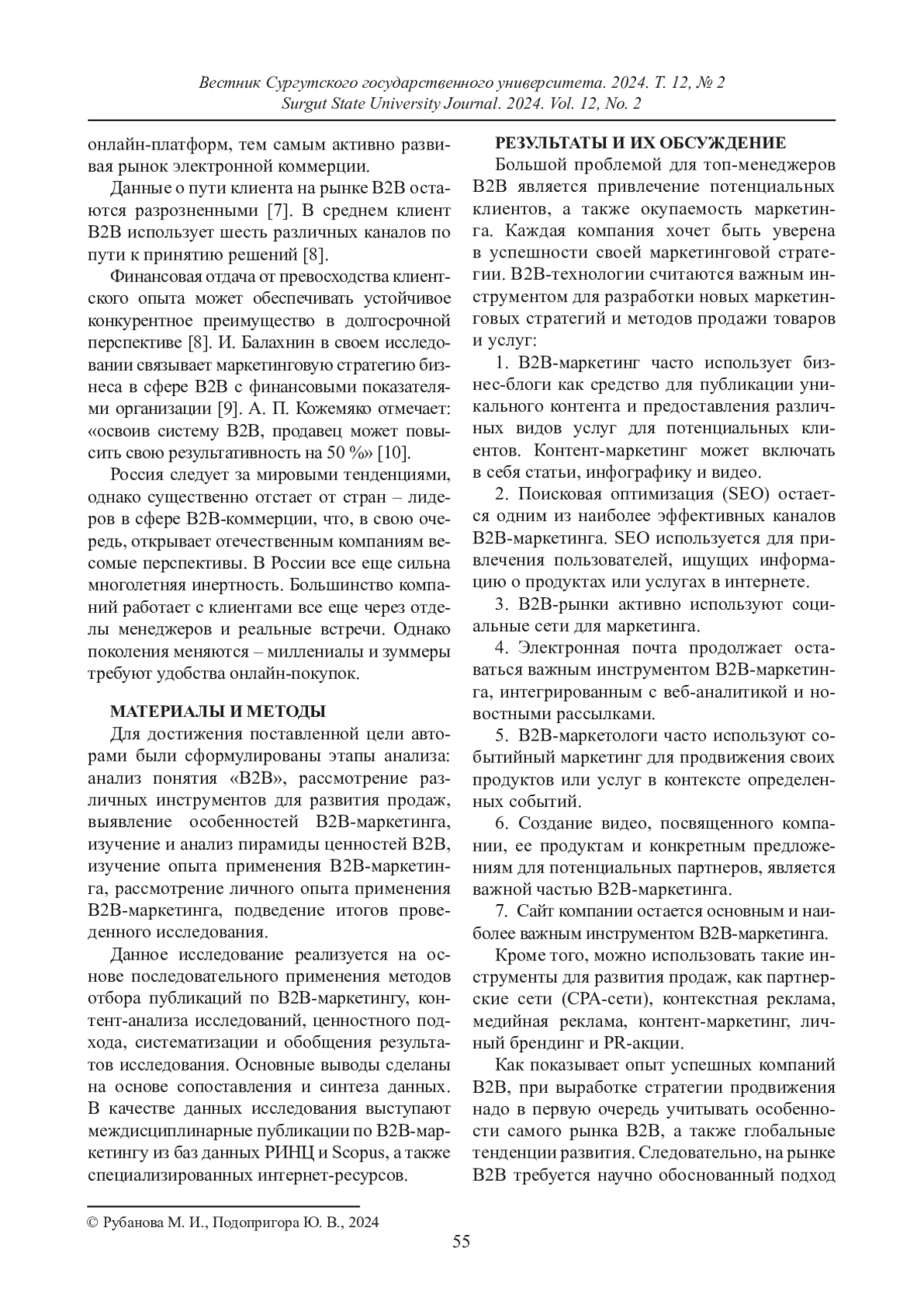11. Брежнева В. М., Петрушина В. В. Исследование стратегических направлений развития B2B-продаж в современной экономике // Вестник Кемеровского государственного университета. Серия: Политические, социологические и экономические науки. 2020. Т. 5, № 1. С. 74-84. https://doi.org/10.21603/2500-3372-2020-5-1-74-84.
