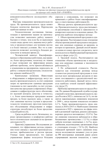 В статье исследуется влияние инвестиций в капитал здоровья на производительность труда на примере конкретного предприятия. Авторы провели кейс-стади анализ корпоративной программы по снижению травматизма на предприятии, изучили базис теории капитала здоровья и разработали стратегии по увеличению капитала здоровья и производительности труда. Особенностью авторского подхода является использование метода кейс-стади анализа, который позволяет более детально изучить конкретный случай на практике. Результаты исследования показали, что инвестиции в капитал здоровья работников предприятия могут значительно повысить производительность труда, снизить заболеваемость и травматизм, а также улучшить отношения между работниками и предприятием. Выводы авторов подтверждают необходимость инвестирования в капитал здоровья как важного фактора повышения производительности труда на предприятии. Разработанные стратегии могут быть использованы другими компаниями для улучшения условий работы и повышения качества жизни работников.