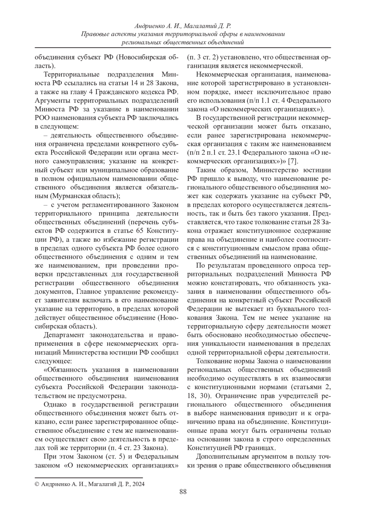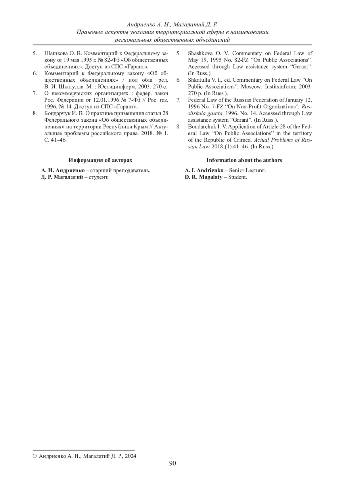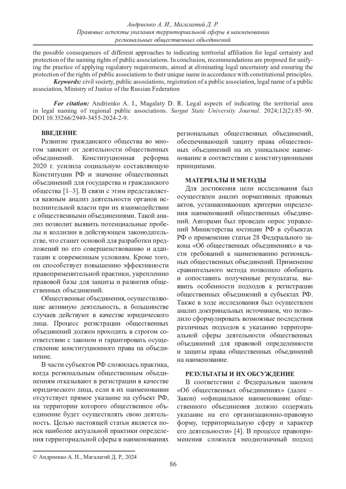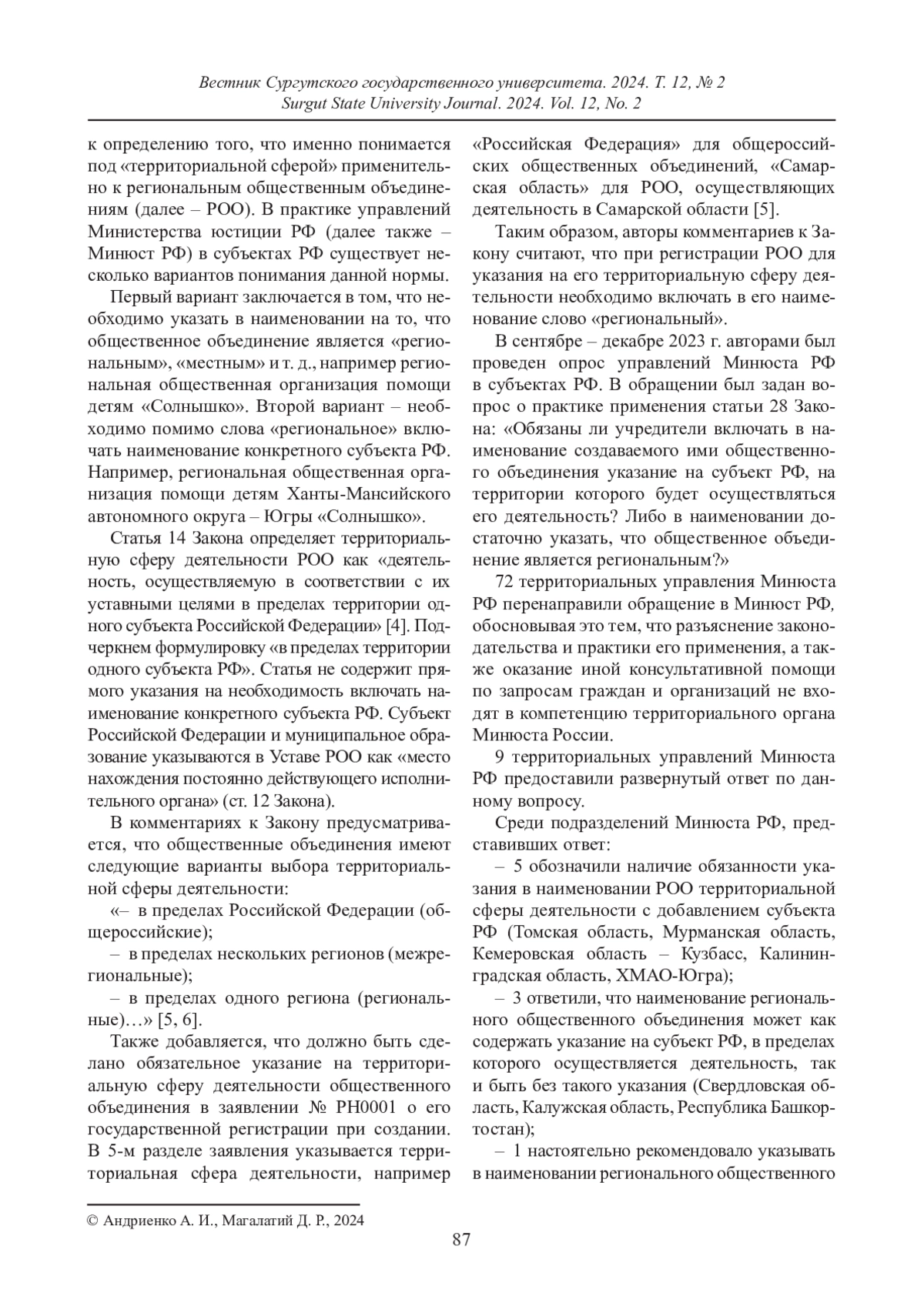 АНДРИЕНКО А. И., МАГАЛАТИЙ Д. Р. ПРАВОВЫЕ АСПЕКТЫ УКАЗАНИЯ ТЕРРИТОРИАЛЬНОЙ СФЕРЫ В НАИМЕНОВАНИИ РЕГИОНАЛЬНЫХ ОБЩЕСТВЕННЫХ ОБЪЕДИНЕНИЙ // ВЕСТНИК СУРГУТСКОГО ГОСУДАРСТВЕННОГО УНИВЕРСИТЕТА. 2024. ТОМ 12, № 2