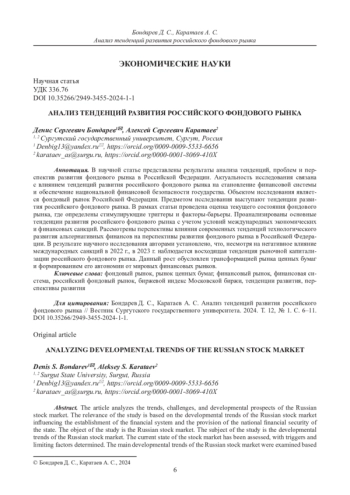 В научной статье представлены результаты анализа тенденций, проблем и перспектив развития фондового рынка в Российской Федерации. Актуальность исследования связана с влиянием тенденций развития российского фондового рынка на становление финансовой системы и обеспечение национальной финансовой безопасности государства. Объектом исследования является фондовый рынок Российской Федерации. Предметом исследования выступают тенденции развития российского фондового рынка. В рамках статьи проведена оценка текущего состояния фондового рынка, где определены стимулирующие триггеры и факторы-барьеры. Проанализированы основные тенденции развития российского фондового рынка с учетом условий международных экономических и финансовых санкций. Рассмотрены перспективы влияния современных тенденций технологического развития альтернативных финансов на перспективы развития фондового рынка в Российской Федерации. В результате научного исследования авторами установлено, что, несмотря на негативное влияние международных санкций в 2022 г., в 2023 г. наблюдается восходящая тенденция рыночной капитализации российского фондового рынка. Данный рост обусловлен трансформацией рынка ценных бумаг и формированием его автономии от мировых финансовых рынков.