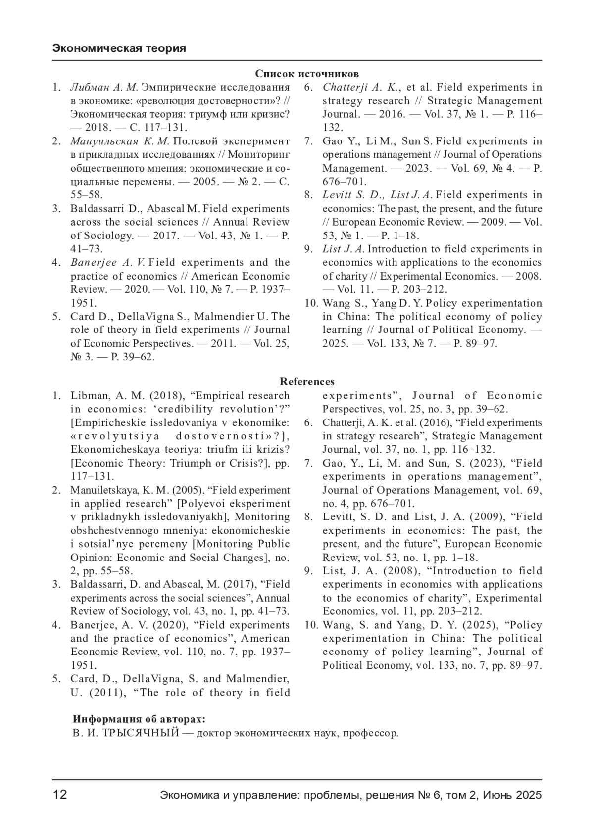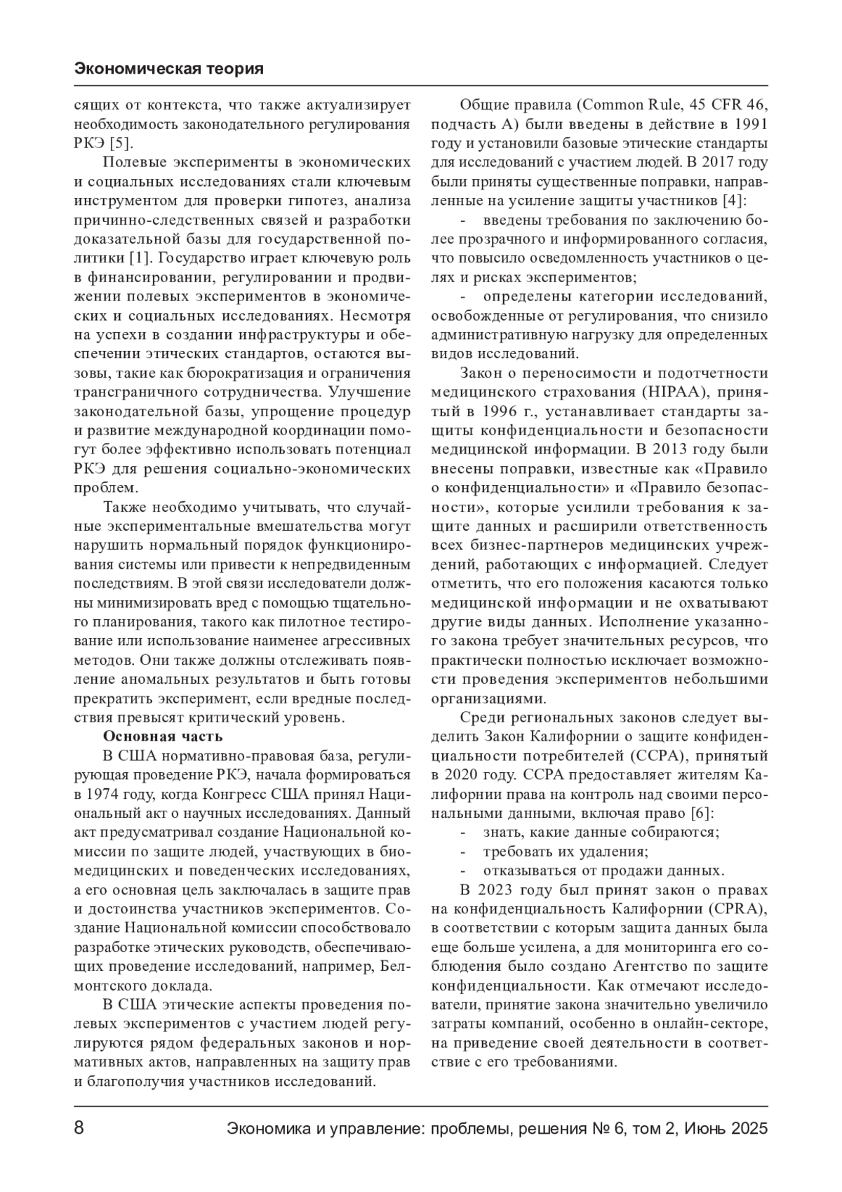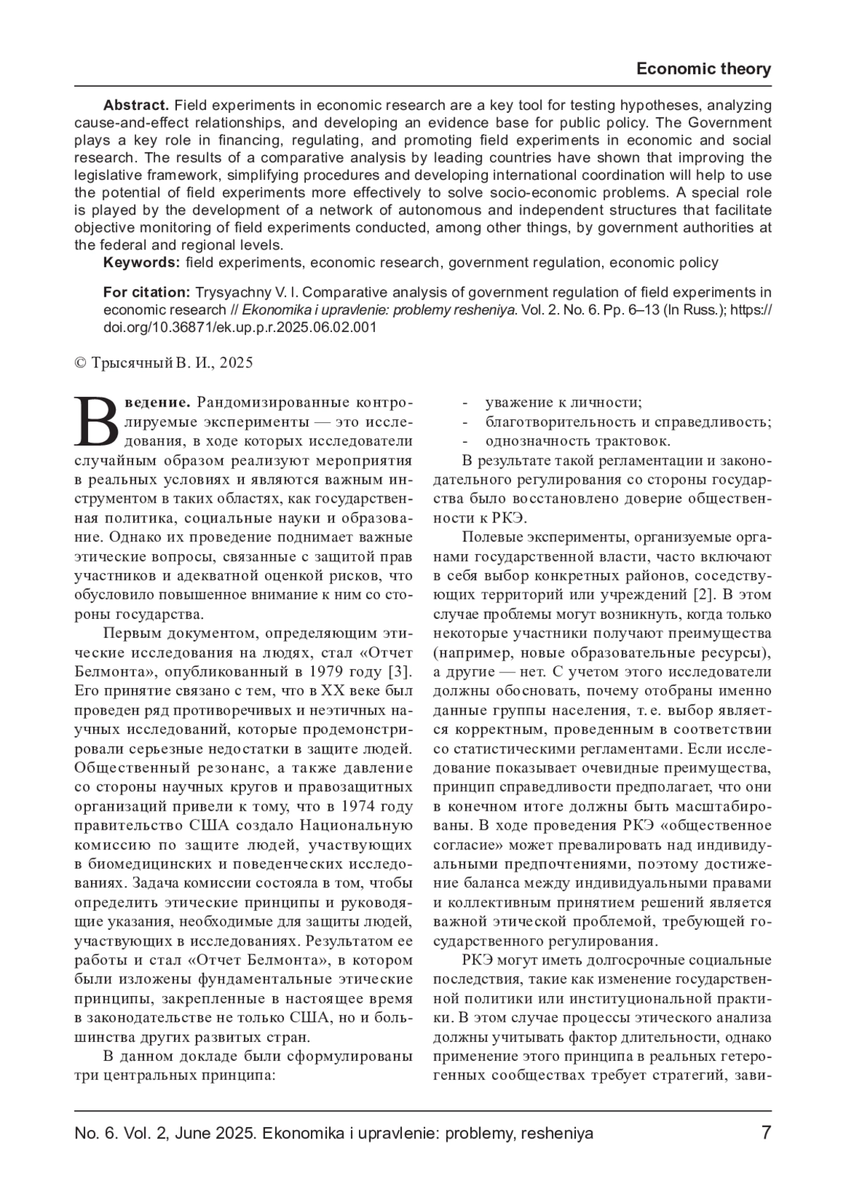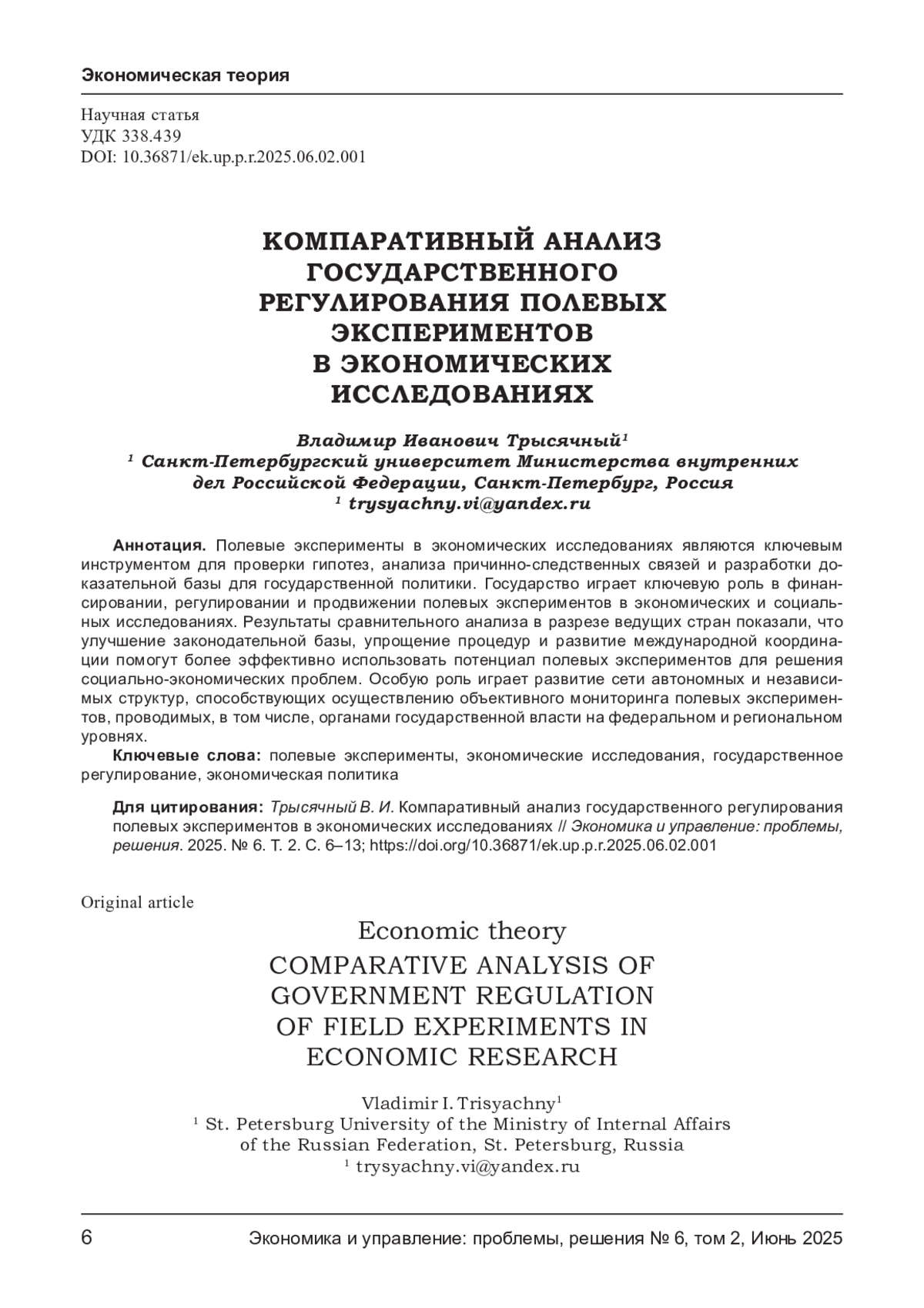 ТРЫСЯЧНЫЙ В. И. КОМПАРАТИВНЫЙ АНАЛИЗ ГОСУДАРСТВЕННОГО РЕГУЛИРОВАНИЯ ПОЛЕВЫХ ЭКСПЕРИМЕНТОВ В ЭКОНОМИЧЕСКИХ ИССЛЕДОВАНИЯХ // ЭКОНОМИКА И УПРАВЛЕНИЕ: ПРОБЛЕМЫ, РЕШЕНИЯ. 2025. ТОМ 2 № 6