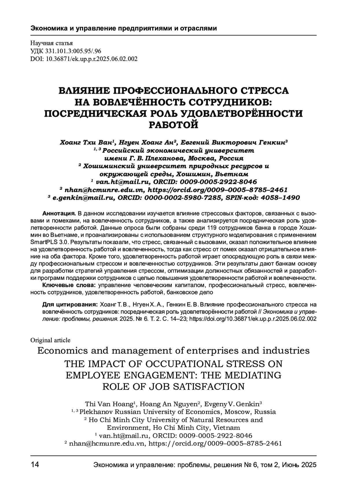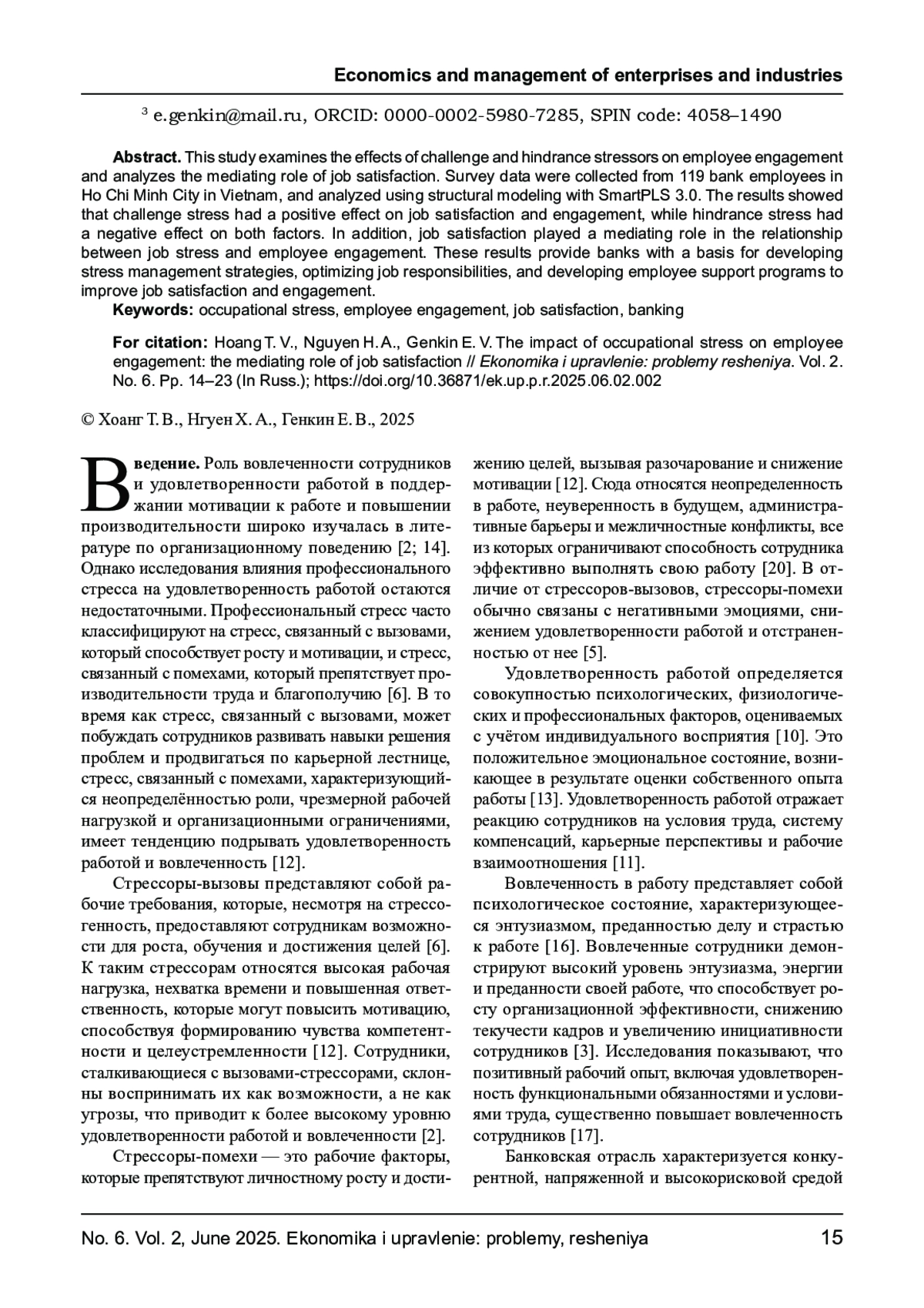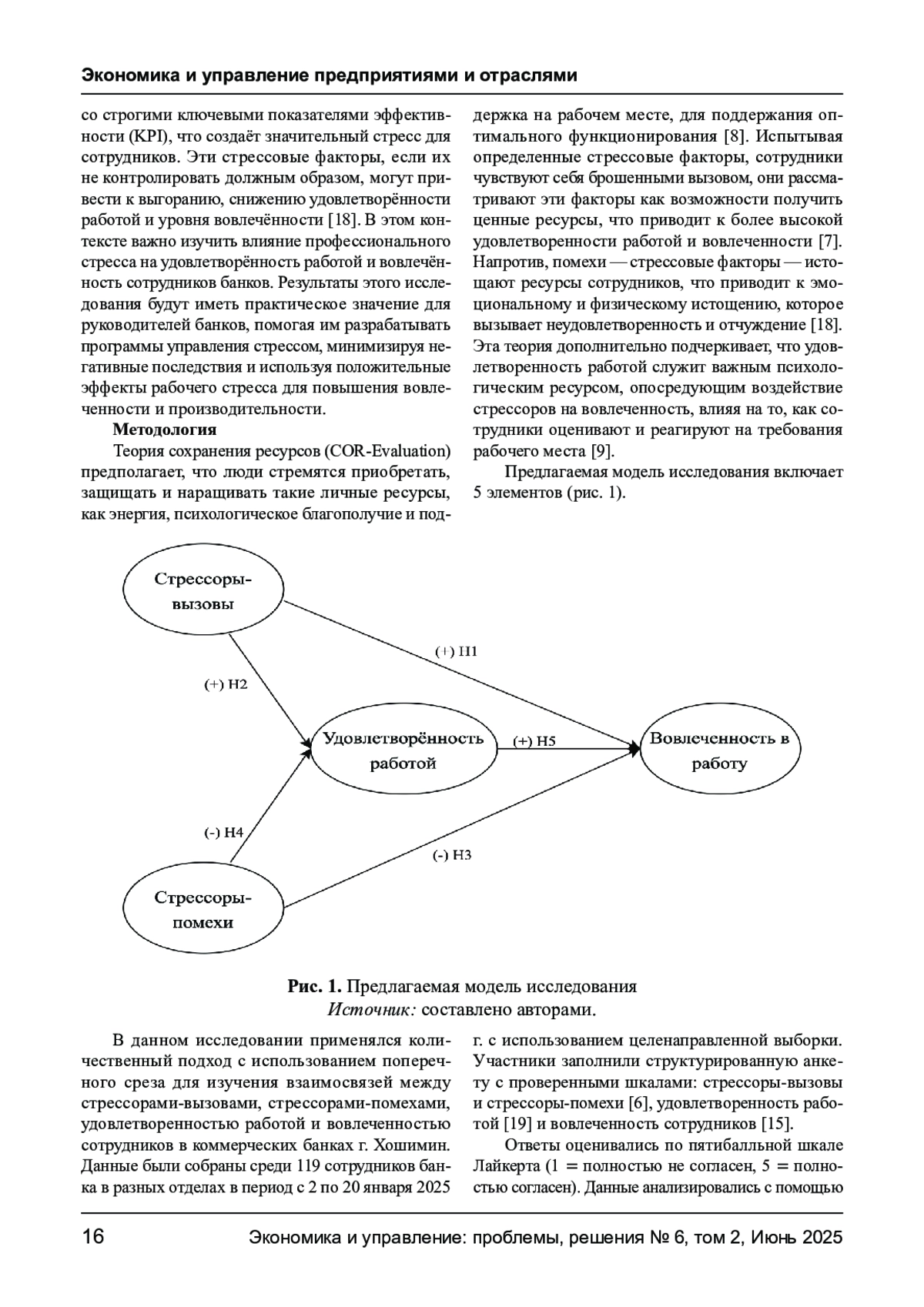 В данном исследовании изучается влияние стрессовых факторов, связанных с вызовами и помехами, на вовлеченность сотрудников, а также анализируется посредническая роль удовлетворенности работой. Данные опроса были собраны среди 119 сотрудников банка в городе Хошимин во Вьетнаме, и проанализированы с использованием структурного моделирования с применением SmartPLS 3.0. Результаты показали, что стресс, связанный с вызовами, оказал положительное влияние на удовлетворенность работой и вовлеченность, тогда как стресс от помех оказал отрицательное влияние на оба фактора. Кроме того, удовлетворенность работой играет опосредующую роль в связи между профессиональным стрессом и вовлеченностью сотрудников. Эти результаты дают банкам основу для разработки стратегий управления стрессом, оптимизации должностных обязанностей и разработки программ поддержки сотрудников с целью повышения удовлетворенности работой и вовлеченности.