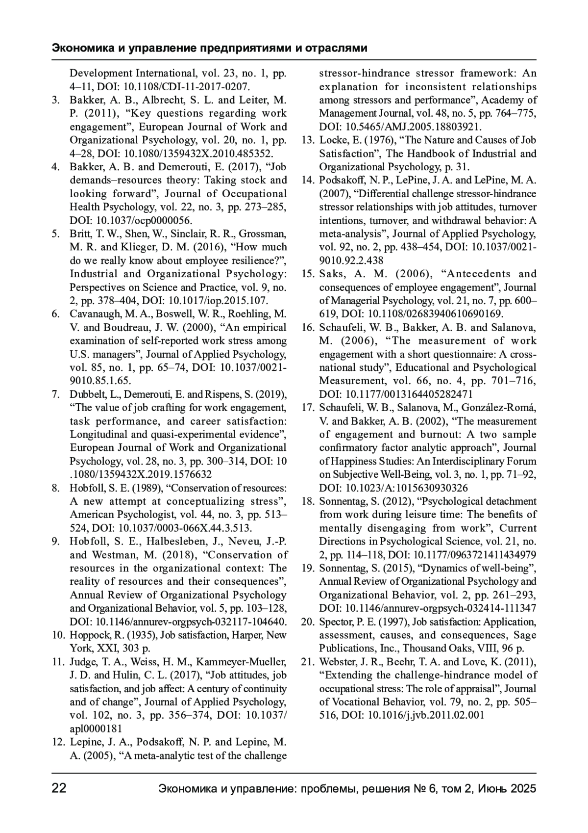 4. Bakker A. B., Demerouti E. Job demands-resources theory: Taking stock and looking forward // Journal of Occupational Health Psychology. - 2017. - Vol. 22, № 3. - P. 273-285. -. DOI: 10.1037/ocp0000056