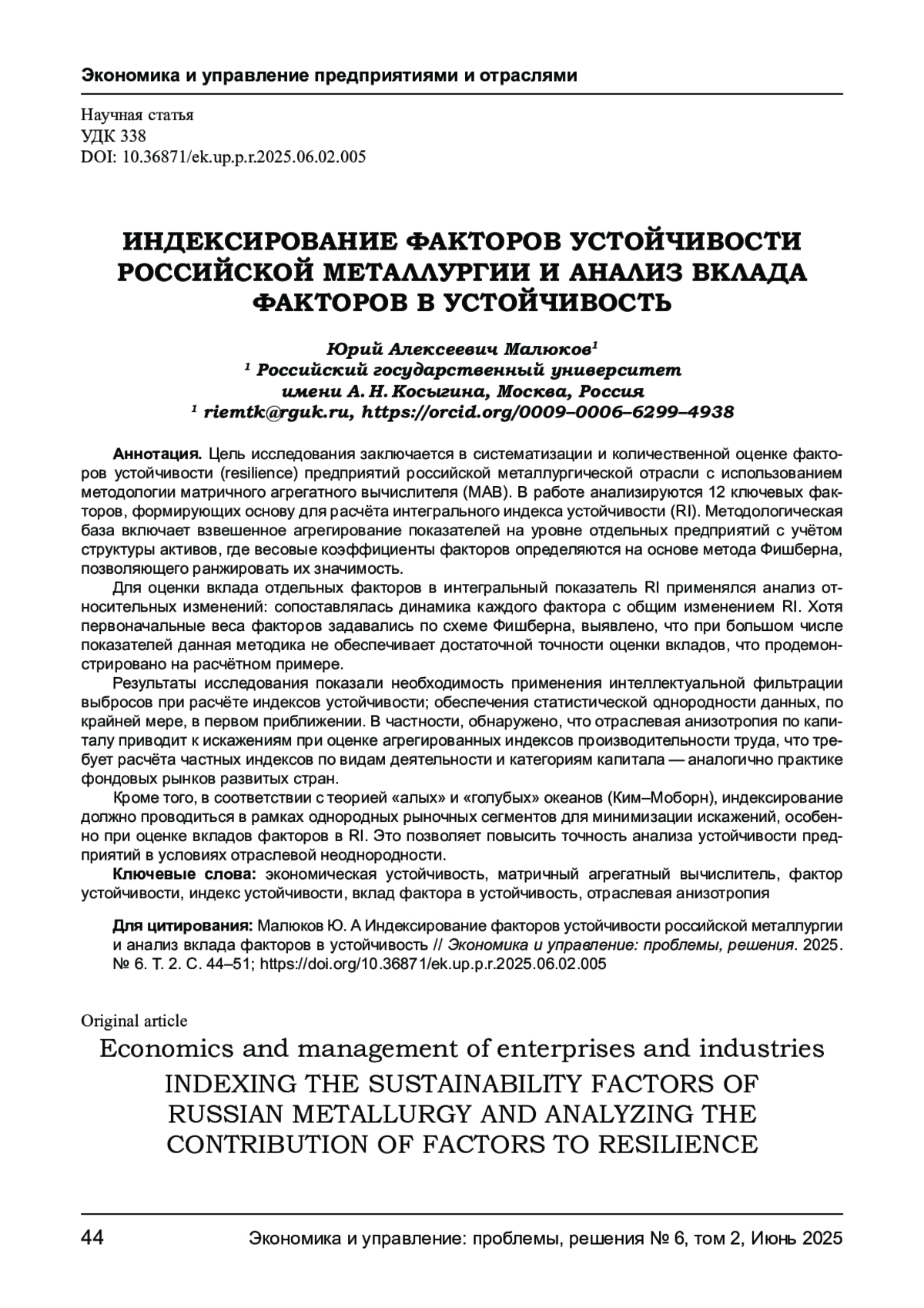 Цель исследования заключается в систематизации и количественной оценке факторов устойчивости (resilience) предприятий российской металлургической отрасли с использованием методологии матричного агрегатного вычислителя (МАВ). В работе анализируются 12 ключевых факторов, формирующих основу для расчёта интегрального индекса устойчивости (RI). Методологическая база включает взвешенное агрегирование показателей на уровне отдельных предприятий с учётом структуры активов, где весовые коэффициенты факторов определяются на основе метода Фишберна, позволяющего ранжировать их значимость.