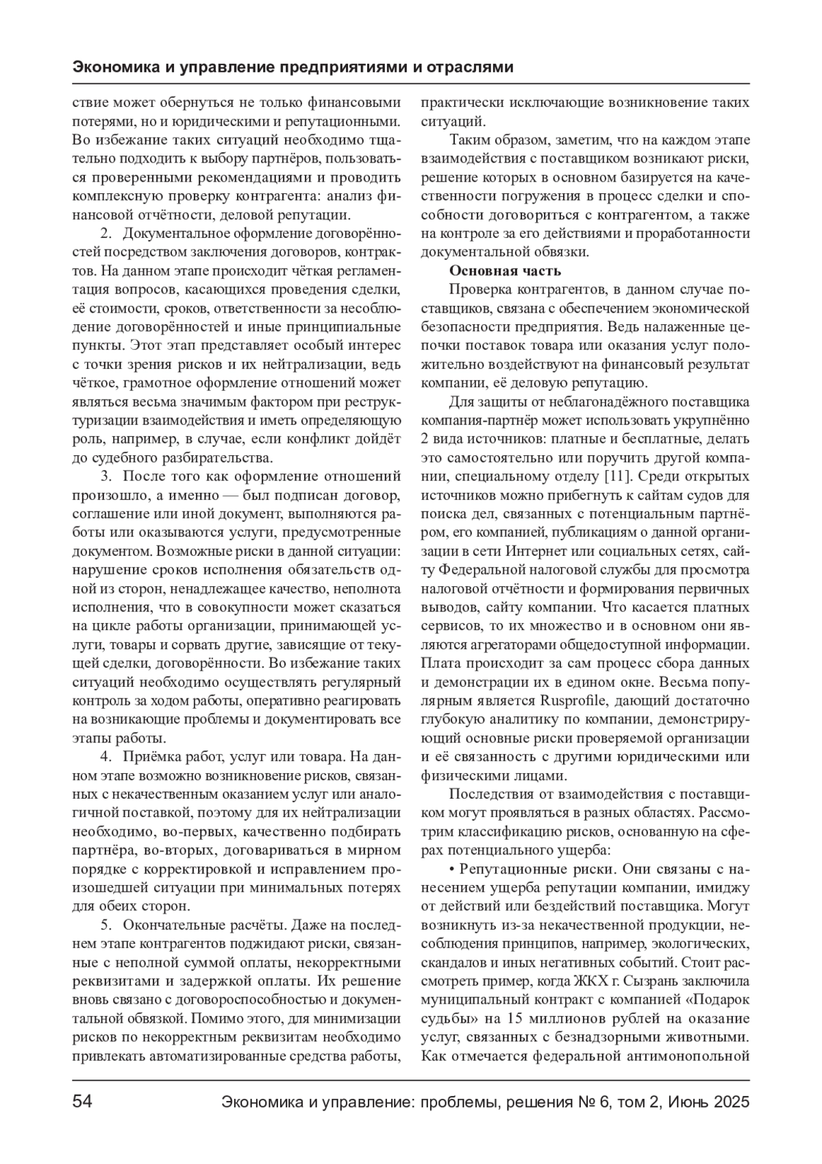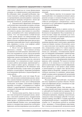 МОРГУНОВА Р. В., ВАКУЛЕНКО О. С. РИСКИ ФИРМЫ ПРИ ВЗАИМОДЕЙСТВИИ С ПОСТАВЩИКАМИ // ЭКОНОМИКА И УПРАВЛЕНИЕ: ПРОБЛЕМЫ, РЕШЕНИЯ. 2025. ТОМ 2 № 6