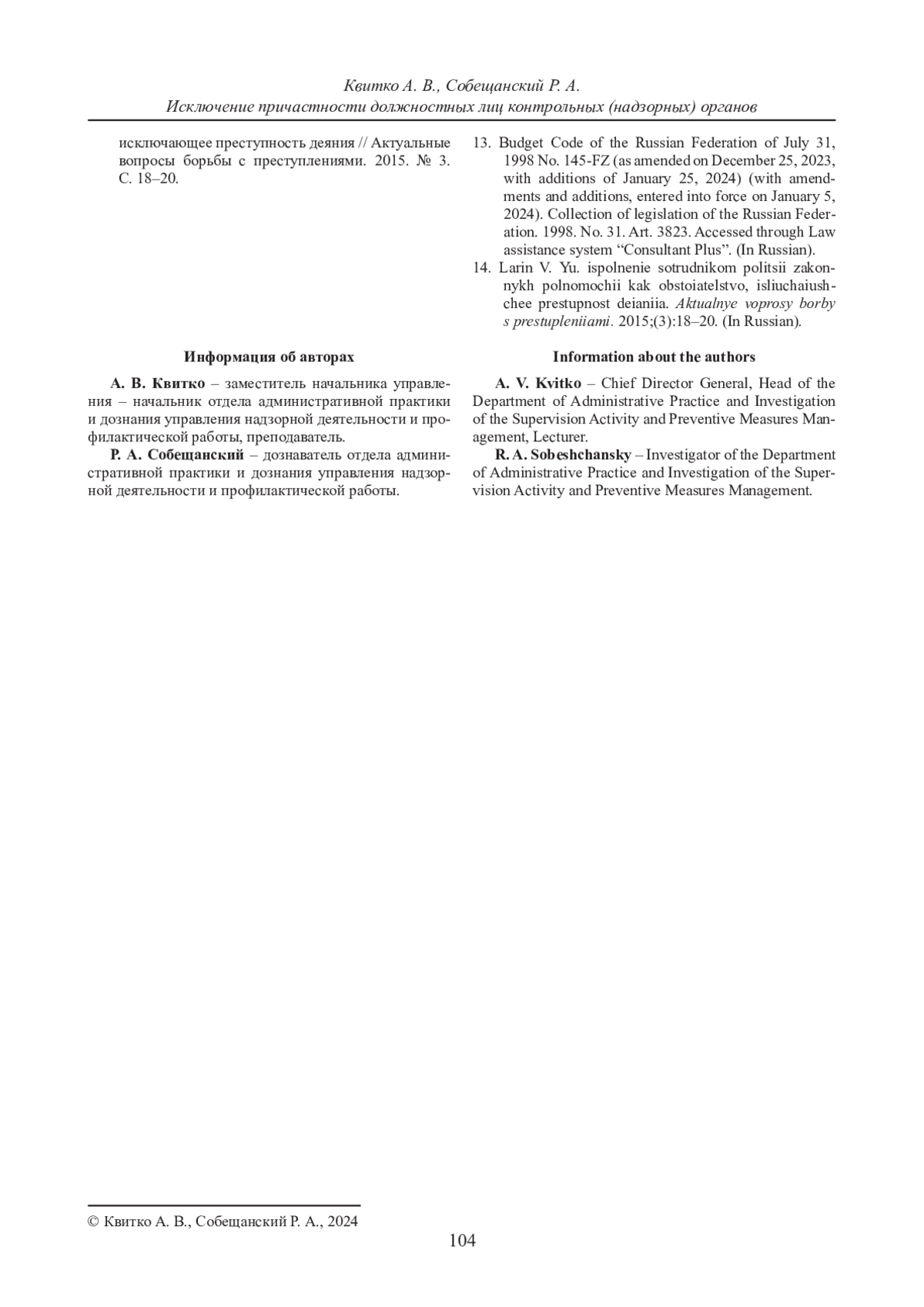 КВИТКО А. В., СОБЕЩАНСКИЙ Р. А. ИСКЛЮЧЕНИЕ ПРИЧАСТНОСТИ ДОЛЖНОСТНЫХ ЛИЦ КОНТРОЛЬНЫХ (НАДЗОРНЫХ) ОРГАНОВ // ВЕСТНИК СУРГУТСКОГО ГОСУДАРСТВЕННОГО УНИВЕРСИТЕТА. 2024. ТОМ 12, № 1