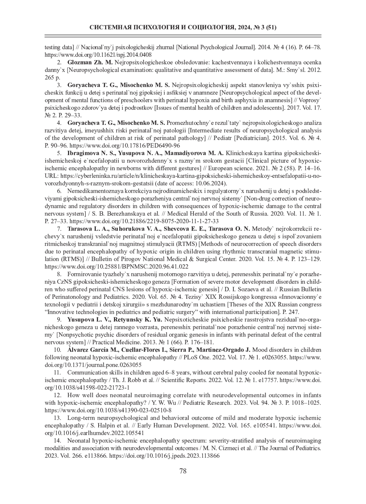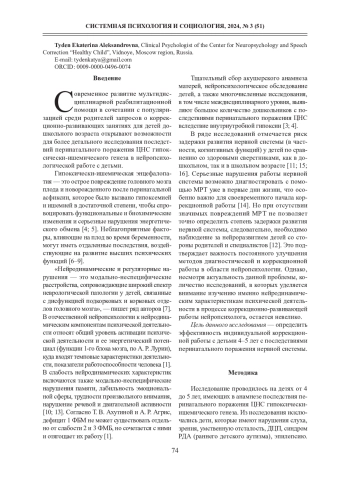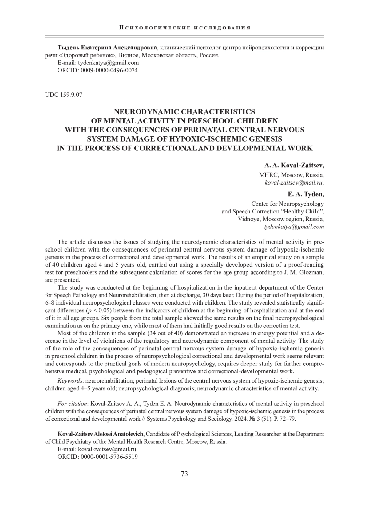 КОВАЛЬ-ЗАЙЦЕВ А. А., ТЫДЕНЬ Е. А. НЕЙРОДИНАМИЧЕСКИЕ ХАРАКТЕРИСТИКИ ПСИХИЧЕСКОЙ ДЕЯТЕЛЬНОСТИ У ДЕТЕЙ ДОШКОЛЬНОГО ВОЗРАСТА С ПОСЛЕДСТВИЯМИ ПЕРИНАТАЛЬНОГО ПОРАЖЕНИЯ ЦНС ГИПОКСИЧЕСКИ-ИШЕМИЧЕСКОГО ГЕНЕЗА В ПРОЦЕССЕ КОРРЕКЦИОННО-РАЗВИВАЮЩЕЙ РАБОТЫ // СИСТЕМНАЯ ПСИХОЛОГИЯ И СОЦИОЛОГИЯ. 2024. № 3 (51)