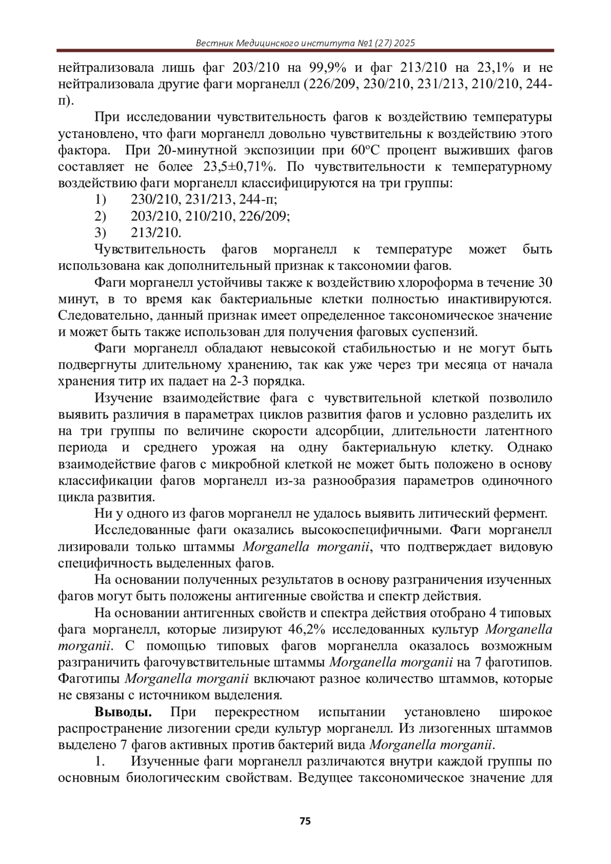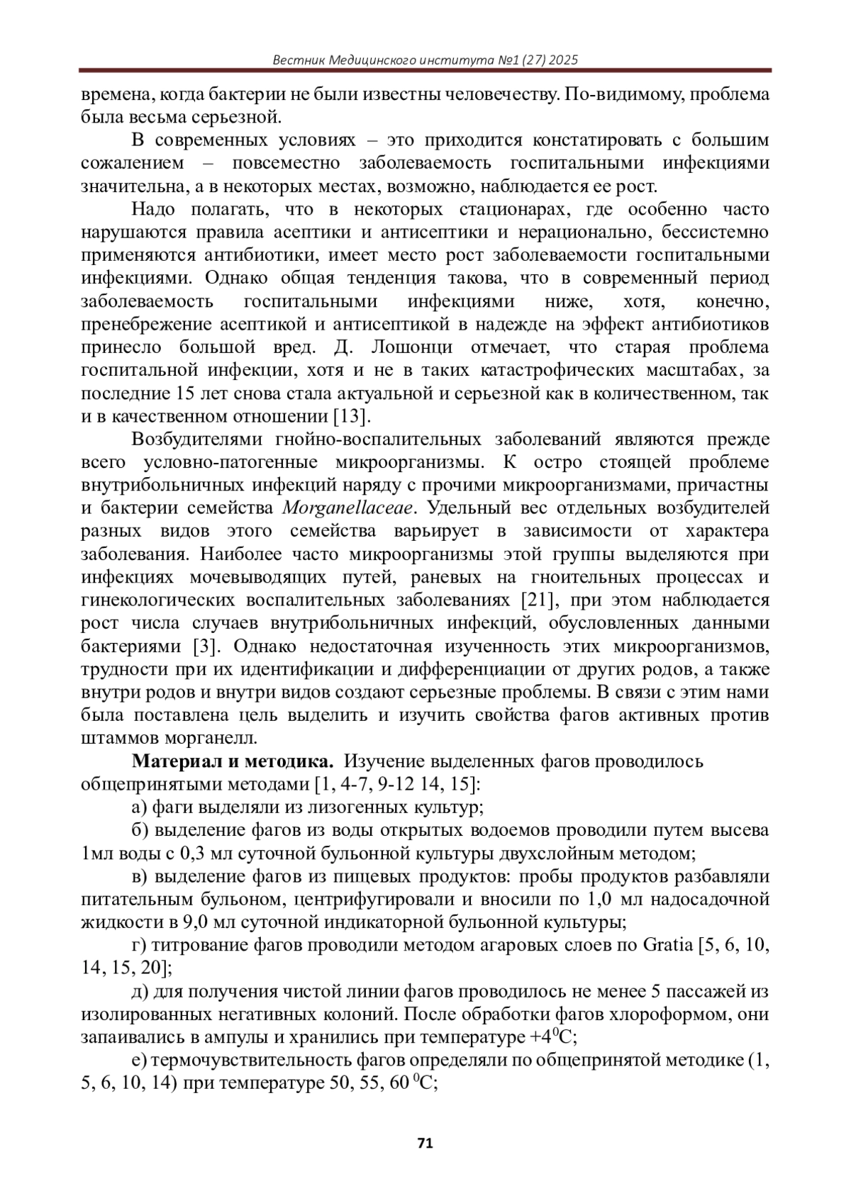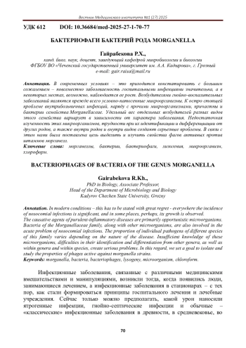В современных условиях - это приходится констатировать с большим сожалением - повсеместно заболеваемость госпитальными инфекциями значительна, а в некоторых местах, возможно, наблюдается ее рост. Возбудителями гнойно-воспалительных заболеваний являются прежде всего условно-патогенные микроорганизмы. К остро стоящей проблеме внутрибольничных инфекций, наряду с прочими микроорганизмами, причастны и бактерии семейства Morganellaceae. Удельный вес отдельных возбудителей разных видов этого семейства варьирует в зависимости от характера заболевания. Недостаточная изученность этих микроорганизмов, трудности при их идентификации и дифференциации от других родов, а также внутри родов и внутри видов создают серьезные проблемы. В связи с этим нами была поставлена цель выделить и изучить свойства фагов активных против штаммов морганелл.