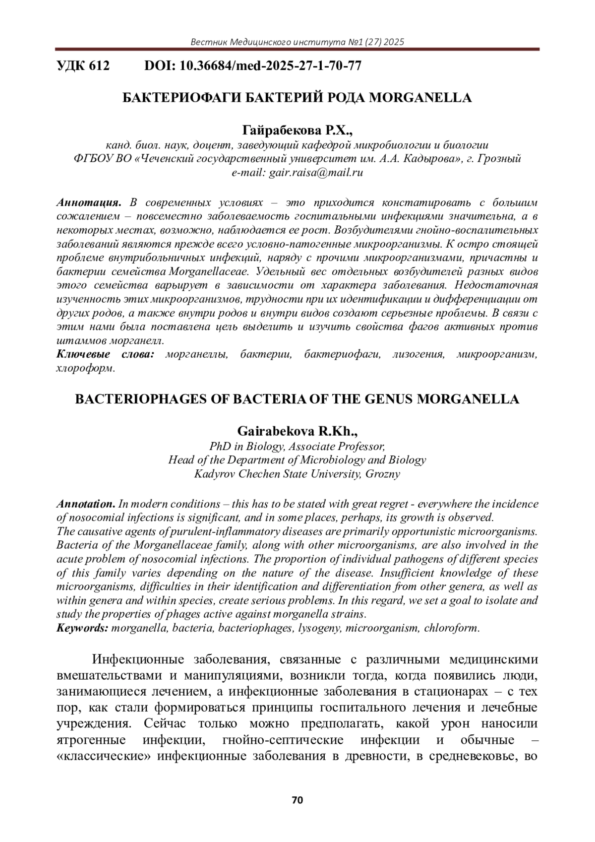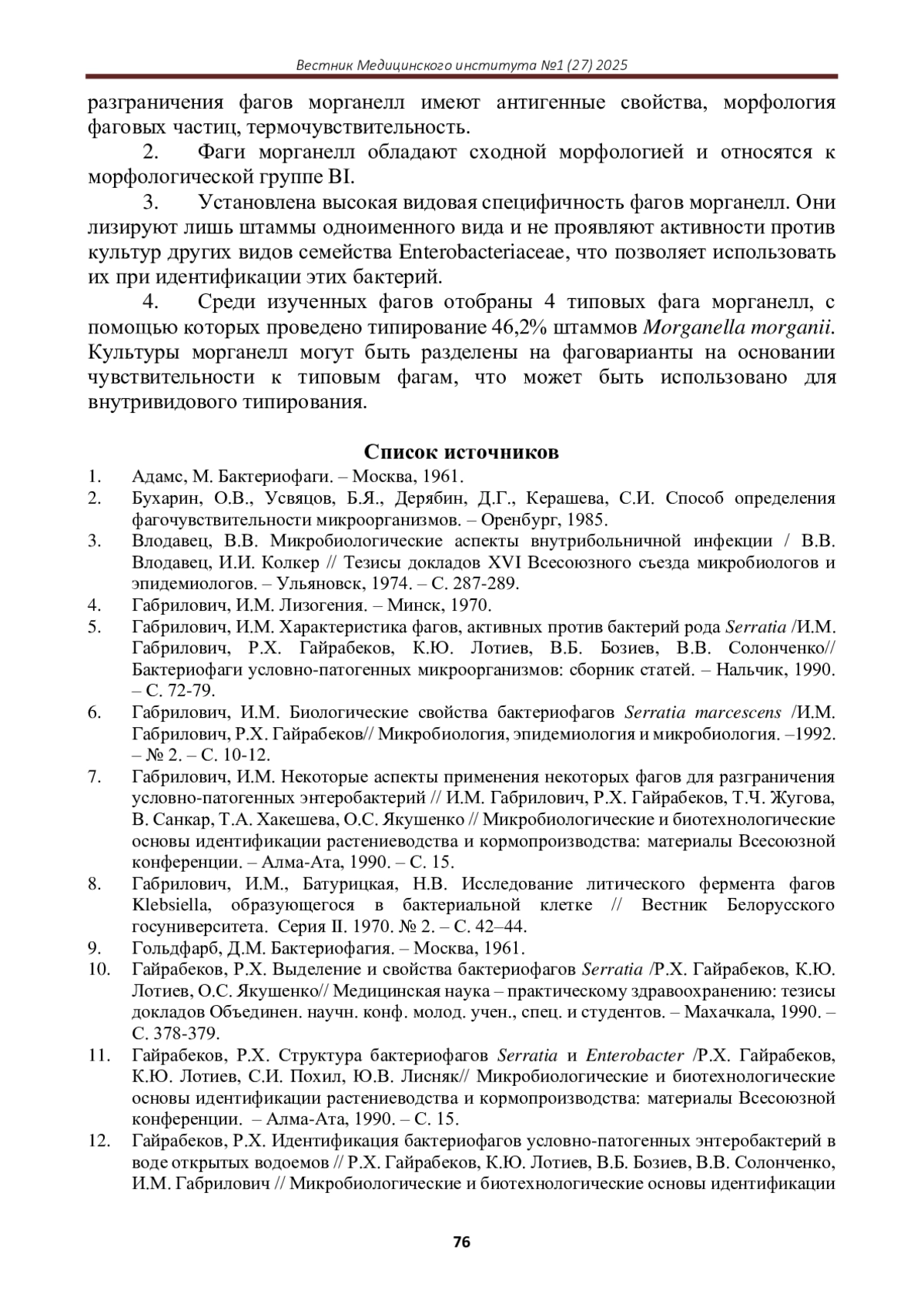 12. Гайрабеков, Р.Х. Идентификация бактериофагов условно-патогенных энтеробактерий в воде открытых водоемов // Р.Х. Гайрабеков, К.Ю. Лотиев, В.Б. Бозиев, В.В. Солонченко, И.М. Габрилович // Микробиологические и биотехнологические основы идентификации растениеводства и кормопроизводства: материалы Всесоюзной конференции. - Алма-Ата, 1990. - С. 62.