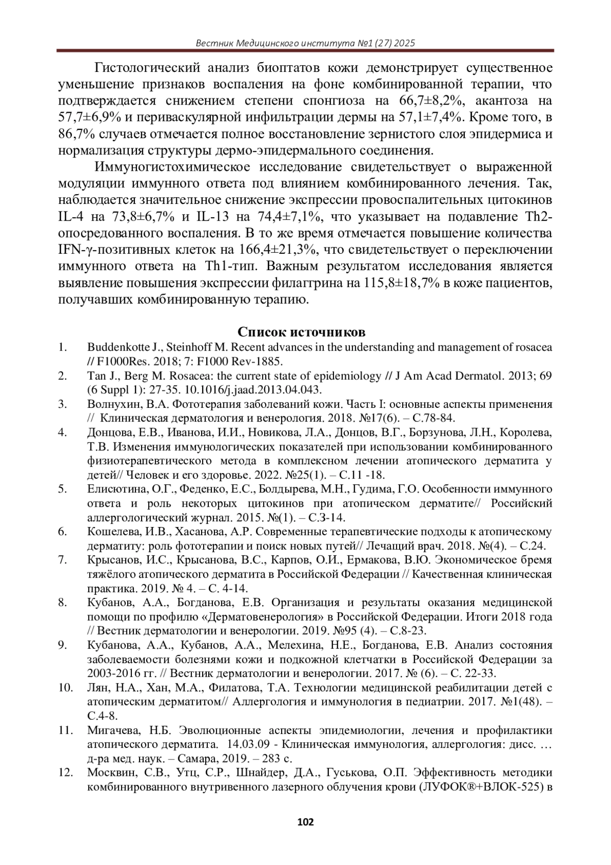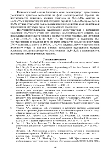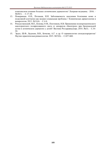 4. Донцова, Е.В., Иванова, И.И., Новикова, Л.А., Донцов, В.Г., Борзунова, Л.Н., Королева, Т.В. Изменения иммунологических показателей при использовании комбинированного физиотерапевтического метода в комплексном лечении атопического дерматита у детей// Человек и его здоровье. 2022. №25(1). - С.11 -18. EDN: YABMNL