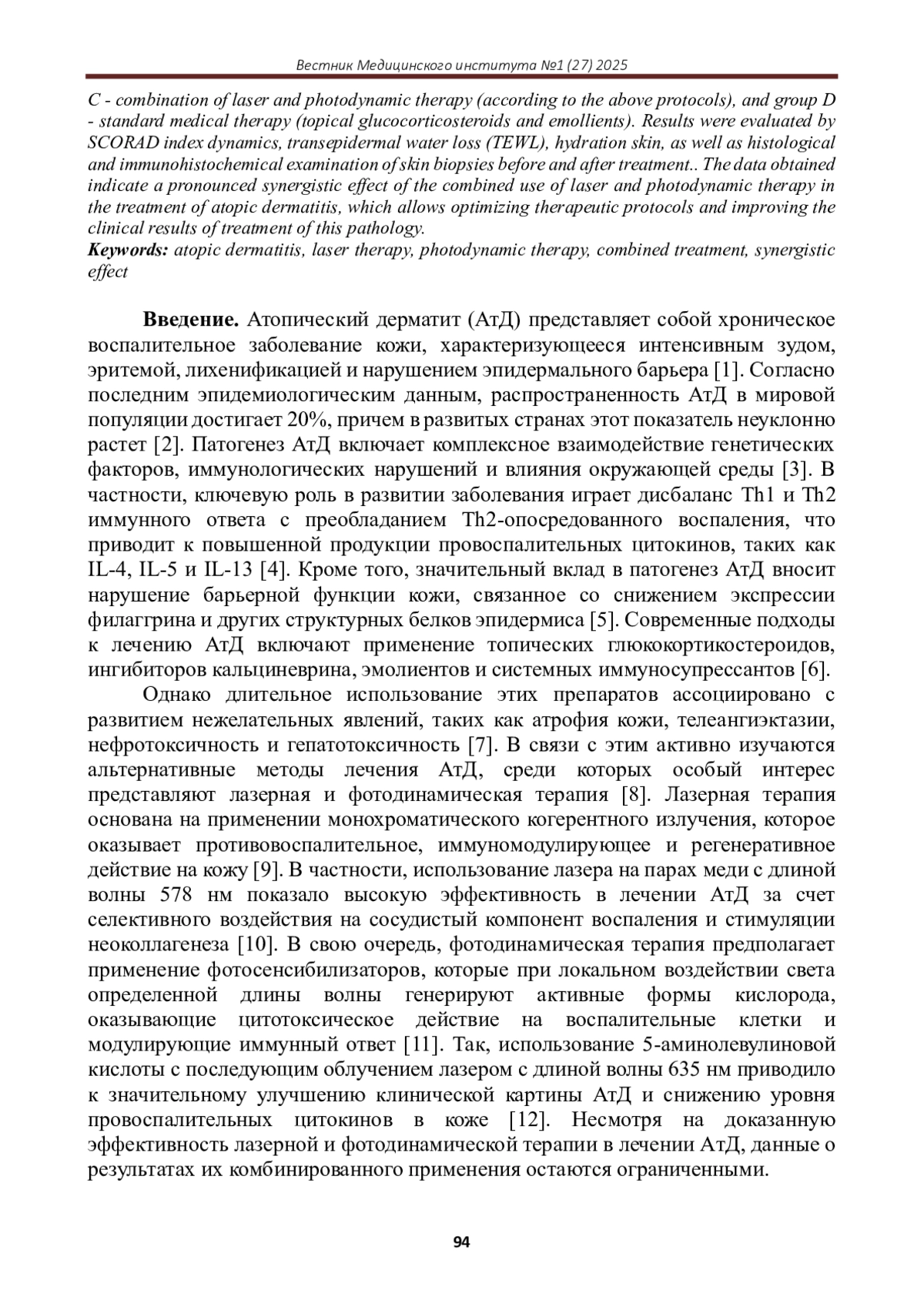 В настоящем исследовании рассматривается комбинированное применение лазерных и фотодинамических методов в лечении атопического дерматита с целью оценки синергетического эффекта и оптимизации терапевтических протоколов. В исследовании приняли участие 120 пациентов с диагнозом «атопический дерматит средней и тяжелой степени тяжести», которые были разделены на 4 группы по 30 человек в каждой. Группа А получала только лазерную терапию (лазер на парах меди с длиной волны 578 нм, плотность энергии 12 Дж/см2, 8 процедур), группа B - только фотодинамическую терапию (5-аминолевулиновая кислота в концентрации 20%, экспозиция 3 часа, облучение лазером с длиной волны 635 нм, плотность энергии 37 Дж/см2, 4 процедуры), группа C - комбинацию лазерной и фотодинамической терапии (по вышеуказанным протоколам), а группа D - стандартную медикаментозную терапию (топические глюкокортикостероиды и эмолиенты). Результаты оценивались по динамике индекса SCORAD, трансэпидермальной потере воды (TEWL), гидратации кожи, а также гистологическому и иммуногистохимическому исследованию биоптатов кожи до и после лечения.. Полученные данные свидетельствуют о выраженном синергетическом эффекте комбинированного применения лазерной и фотодинамической терапии в лечении атопического дерматита, что позволяет оптимизировать терапевтические протоколы и улучшить клинические результаты лечения данной патологии.
