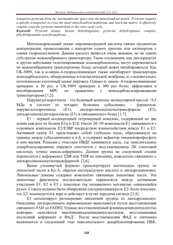Митохондриальный захват пировиноградной кислоты связан градиентом концентрации, происходящим с импортом одного протона или антипортом с одним гидроксид-ионом. Данная кислота является очень важным, но не одним субстратом межмембранного транспортера. Такие соединения, как дихлорацетат и другие небольшие галогенированные монокарбоксилаты, могут перемещаться по межмембранному транспортному белку, который может ингибироваться. Как UK-5099, так и α-циано-4-гидроксициннамат также ингибируют транспортеры монокарбоксилата, обнаруженные в плазматической мембране, и, следовательно, потенциально клеточный захват пирувата. Однако α- циано -4-гидроксициннамат примерно в 30 раз, а UK-5099 примерно в 300 раз более эффективен в ингибировании MPC по сравнению с монокарбоксилированными транспортерами [1,2].