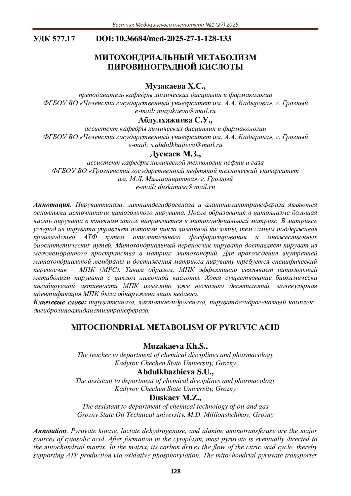 Представлен анализ структуры, частоты и смертности от рака молочной железы женщин Чеченской Республики за период 2007-2024 гг. Изучена динамика частоты впервые выявленных случаев рака молочной железы в доле общей заболеваемости злокачественных новообразований женской репродуктивной системы. Рассмотрена частота рака молочной железы по возрастным группам среди женщин Чеченской республики. Проведен анализ структуры рака молочной железы по стадиям развития. Ключевым фактором является ранняя диагностика и своевременно начатая терапия лечения рака молочной железы.