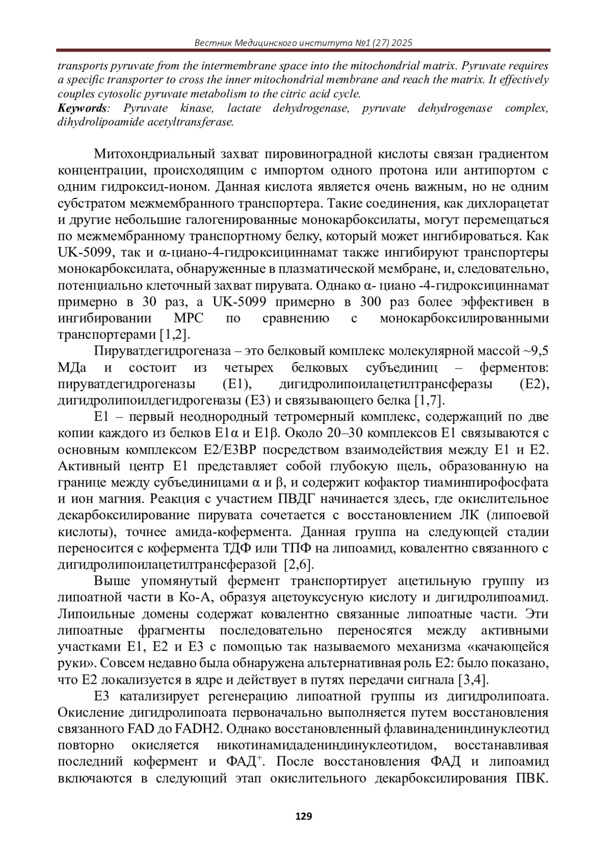 Пируваткиназа, лактатдегидрогеназа и аланинаминотрансфераза являются основными источниками цитозольного пирувата. После образования в цитоплазме большая часть пирувата в конечном итоге направляется в митохондриальный матрикс. В матриксе углерод из пирувата управляет потоком цикла лимонной кислоты, тем самым поддерживая производство АТФ путем окислительного фосфорилирования и множественных биосинтетических путей. Митохондриальный переносчик пирувата доставляет пируват из межмембранного пространства в матрикс митохондрий. Для прохождения внутренней митохондриальной мембраны и достижения матрикса пирувату требуется специфический переносчик - МПК (MPC). Таким образом, МПК эффективно связывает цитозольный метаболизм пирувата с циклом лимонной кислоты. Хотя существование биохимически ингибируемой активности МПК известно уже несколько десятилетий, молекулярная идентификация МПК была обнаружена лишь недавно.