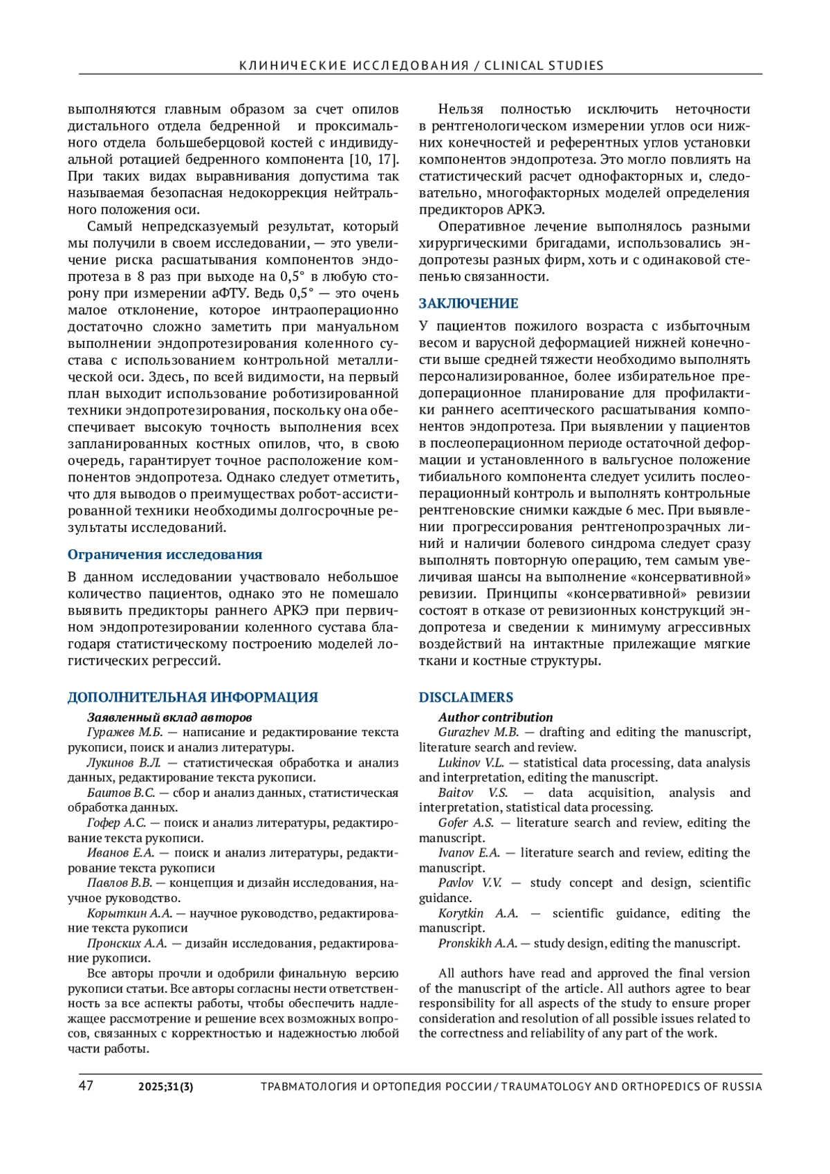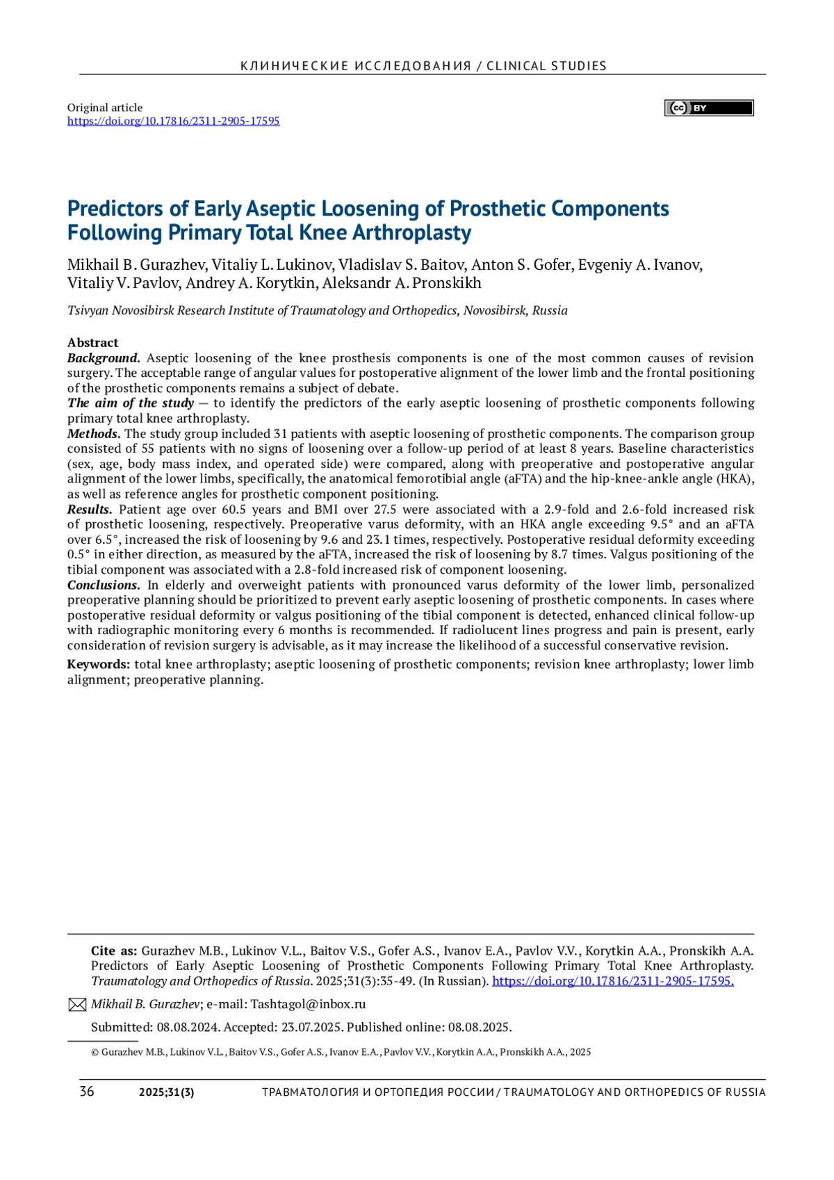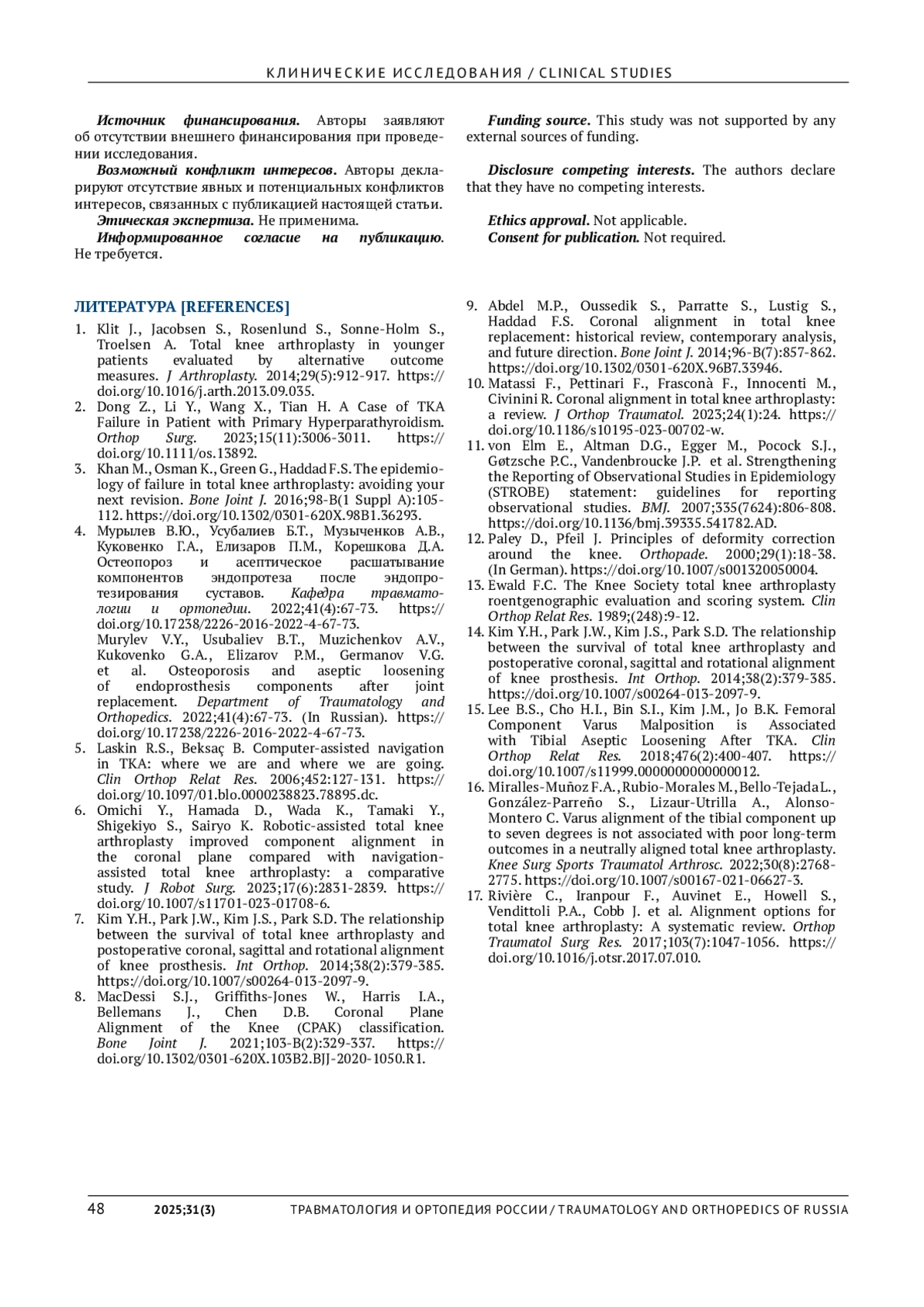 Заключение. У пациентов пожилого возраста с избыточным весом, имеющих выраженную варусную деформацию нижней конечности, следует избегать шаблонного предоперационного планирования и отдавать предпочтение персонализированному, более избирательному предоперационному планированию для профилактики раннего асептического расшатывания компонентов эндопротеза. В случаях выявления в послеоперационном периоде остаточной деформации и вальгусного положения тибиального компонента требуется усиленный контроль с проведением рентгенографических исследований каждые 6 мес. При прогрессировании рентгенопрозрачных линий и наличии болевого синдрома необходимо незамедлительно рассмотреть вопрос о проведении повторного хирургического вмешательства, что повышает вероятность успешного выполнения «консервативной» ревизии.
