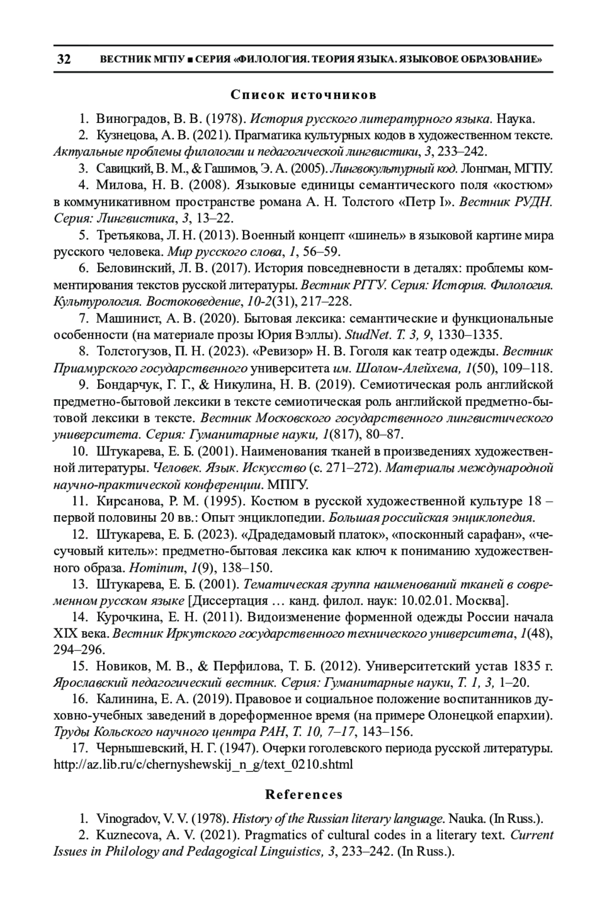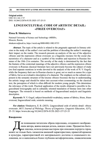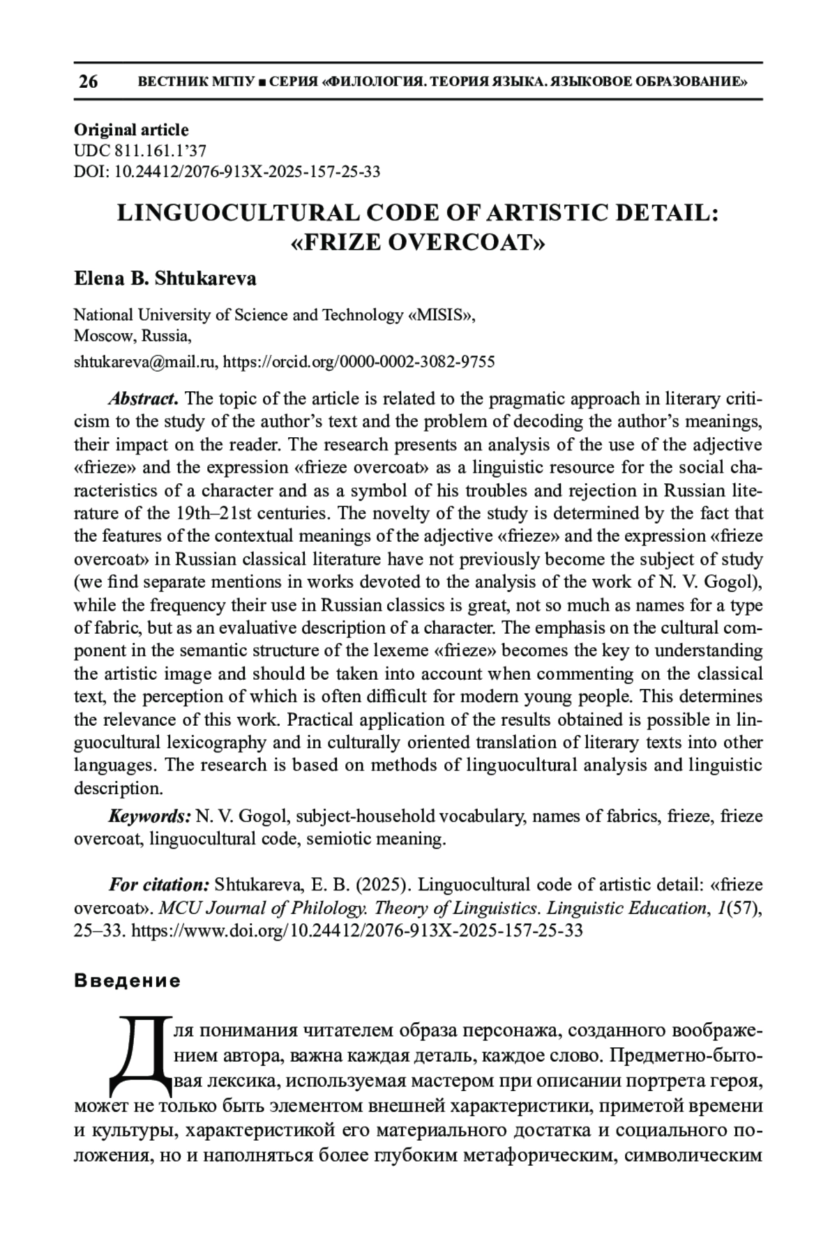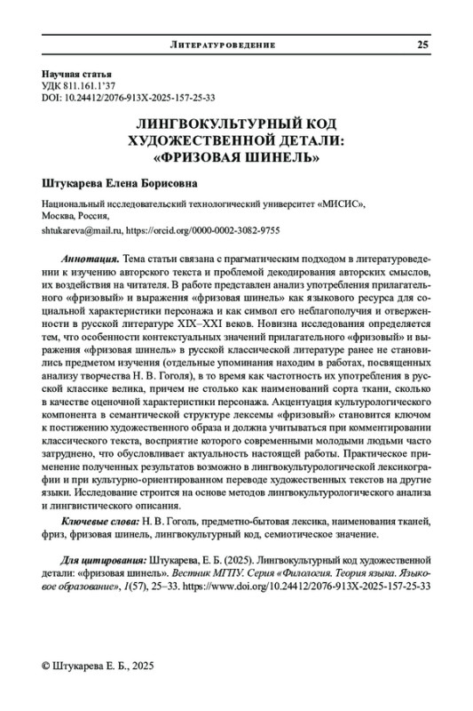 ШТУКАРЕВА Е. Б. ЛИНГВОКУЛЬТУРНЫЙ КОД ХУДОЖЕСТВЕННОЙ ДЕТАЛИ: «ФРИЗОВАЯ ШИНЕЛЬ» // ВЕСТНИК МГПУ. СЕРИЯ: ФИЛОЛОГИЯ. ТЕОРИЯ ЯЗЫКА. ЯЗЫКОВОЕ ОБРАЗОВАНИЕ. 2025. № 1 (57)