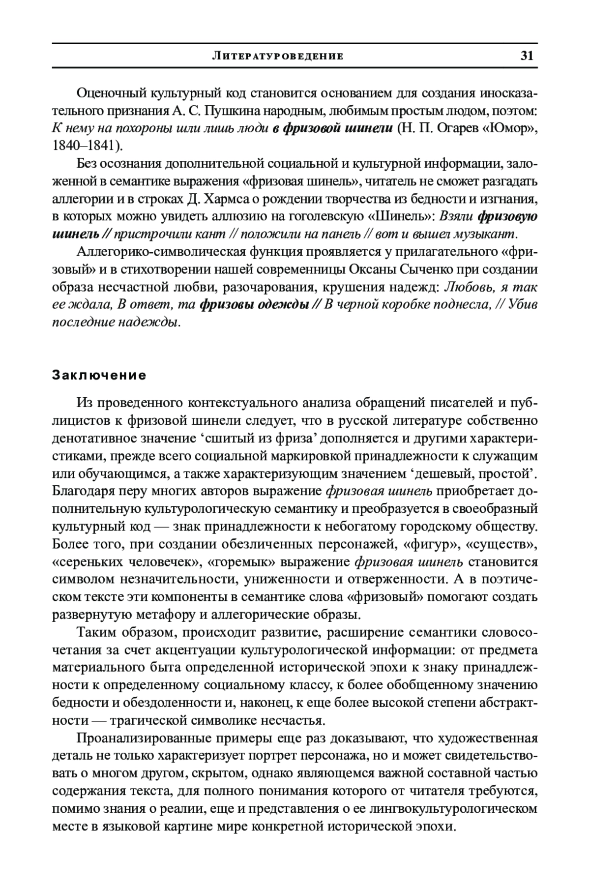 Тема статьи связана с прагматическим подходом в литературоведении к изучению авторского текста и проблемой декодирования авторских смыслов, их воздействия на читателя. В работе представлен анализ употребления прилагательного «фризовый» и выражения «фризовая шинель» как языкового ресурса для социальной характеристики персонажа и как символ его неблагополучия и отверженности в русской литературе XIX-XXI веков. Новизна исследования определяется тем, что особенности контекстуальных значений прилагательного «фризовый» и выражения «фризовая шинель» в русской классической литературе ранее не становились предметом изучения (отдельные упоминания находим в работах, посвященных анализу творчества Н. В. Гоголя), в то время как частотность их употребления в русской классике велика, причем не столько как наименований сорта ткани, сколько в качестве оценочной характеристики персонажа. Акцентуация культурологического компонента в семантической структуре лексемы «фризовый» становится ключом к постижению художественного образа и должна учитываться при комментировании классического текста, восприятие которого современными молодыми людьми часто затруднено, что обусловливает актуальность настоящей работы. Практическое применение полученных результатов возможно в лингвокультурологической лексикографии и при культурно-ориентированном переводе художественных текстов на другие языки. Исследование строится на основе методов лингвокультурологического анализа и лингвистического описания.