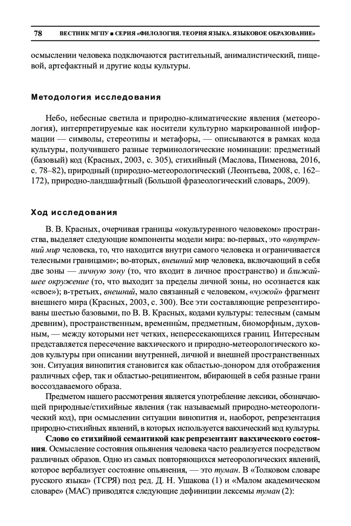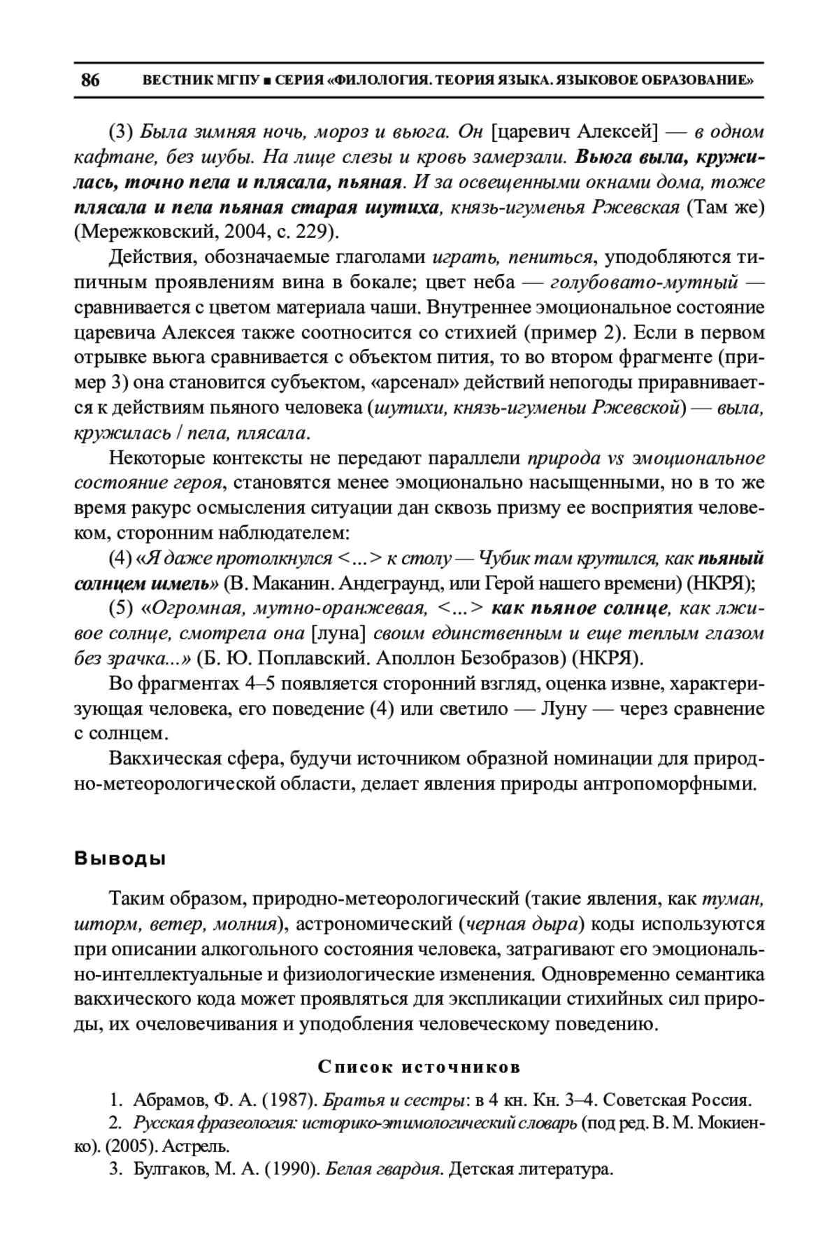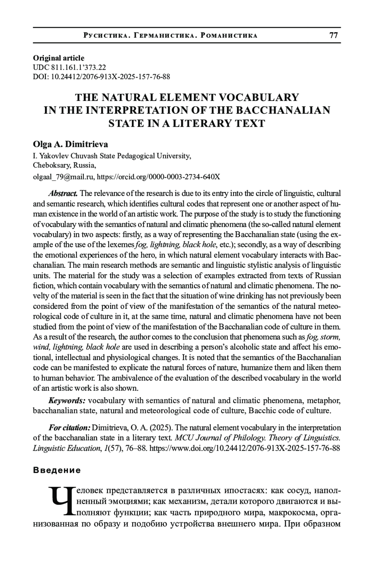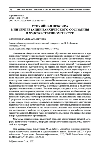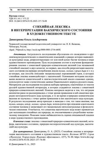Актуальность исследования обусловлена его вхождением в круг лингвокультурологических и семантических изысканий, в рамках которых выявляются культурные коды, репрезентирующие тот или иной аспект бытия человека в мире художественного произведения. Цель исследования состоит в изучении функционирования лексики с семантикой природно-климатических явлений (так называемой стихийной лексики) в двух аспектах: во-первых, как способа репрезентации вакхического состояния (на примере употребления лексем туман, молния, черная дыра и т. п.); во-вторых, как способа описания эмоциональных переживаний героя, в которых стихийная лексика взаимодействует с вакхической. Основными методами исследования являются семантический и лингвостилистический анализ языковых единиц, используются также статистические данные Национального корпуса русского языка. Материалом для исследования послужила выборка примеров, извлеченных из текстов русской художественной литературы, в которых содержится лексика с семантикой природно-климатических явлений. Новизна материала видится в том, что ситуация винопития ранее не рассматривалась с точки зрения проявления в ней семантики природно-метеорологического кода культуры, в то же время и природно-климатические явления не изучались с точки зрения проявления в них вакхического кода культуры. В результате исследования автор приходит к выводам о том, что такие явления, как туман, шторм, ветер, молния, черная дыра, используются при описании алкогольного состояния человека и затрагивают его эмоционально-интеллектуальные и физиологические изменения. Отмечается, что семантика вакхического кода может проявляться для экспликации стихийных сил природы, их очеловечивания и уподобления человеческому поведению. Показана также амбивалентность оценки описываемой лексики в мире художественного произведения.
