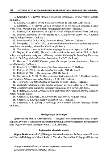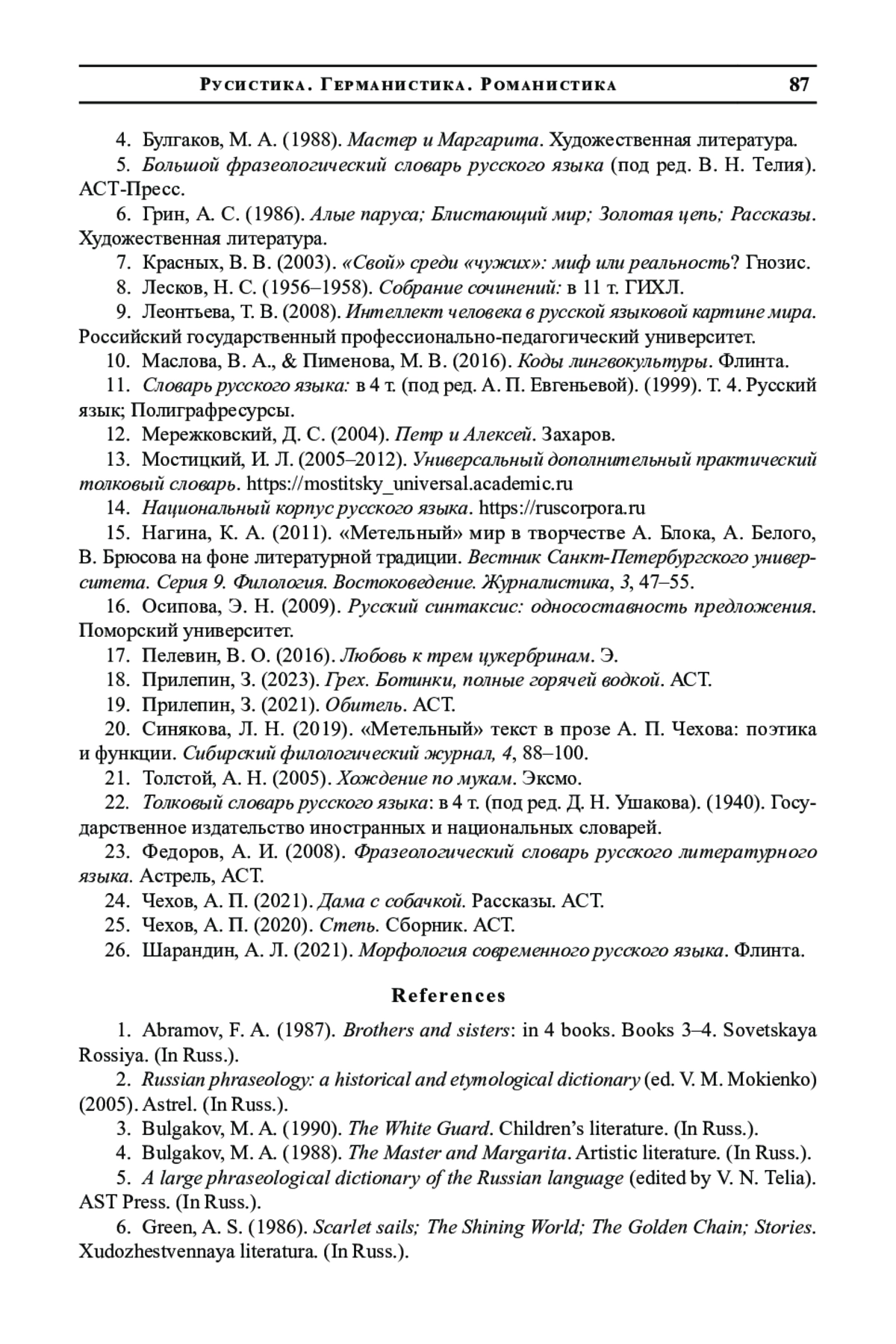 20. Синякова, Л. Н. (2019). “Метельный” текст в прозе А. П. Чехова: поэтика и функции. Сибирский филологический журнал, 4, 88-100. EDN: GEUZPB