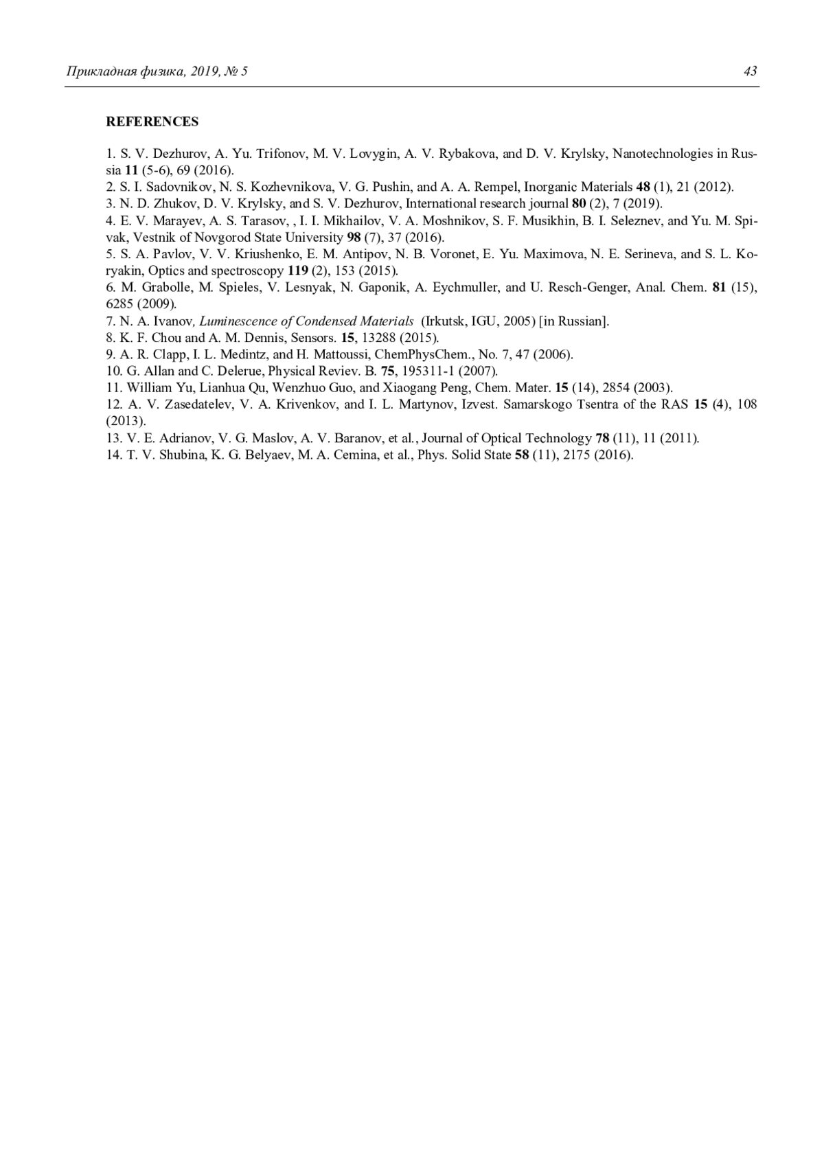S. A. Pavlov, A. S. Pavlov, E. Yu. Maksimova, A. V. Alekseenko, A. V. Pavlov, A. D. Zelenskaya, and E. M. Antipov Influence of nonradiative energy transfer processes of electronic excitation on the efficiency of sensitive layers of fluorescent sensors 37