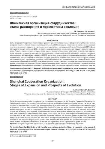 Статья представляет подробный обзор истории и развития Шанхайской организации сотрудничества (ШОС) и ее значения в мировой политике. Начало статьи знакомит с деятельностью ШОС, основными историческими этапами ее становления с момента основания и первыми ее участниками вплоть до момента присоединения Индии и Пакистана в 2017 г. Далее обсуждается текущее состояние ШОС и ее политическая роль, включая возможности для будущего развития и расширения. Развитие экономического сотрудничества, науки и технологий, экологии и устойчивого развития стран и расширение членства и сотрудничества с другими региональными и международными организациями являются ключевыми возможностями для дальнейшего развития ШОС. В заключении анализируются потенциальные вызовы и проблемы, которые могут возникнуть в будущем, включая различия в интересах и приоритетах членов, геополитическое напряжение, экономические и политические проблемы, проблемы безопасности и конкуренцию между членами. В целом, статья представляет обширный обзор ШОС, включая ее историю, текущее состояние, перспективы развития и возможные вызовы и проблемы, что позволяет получить полное понимание роли и значения этой организации в мировой политике.