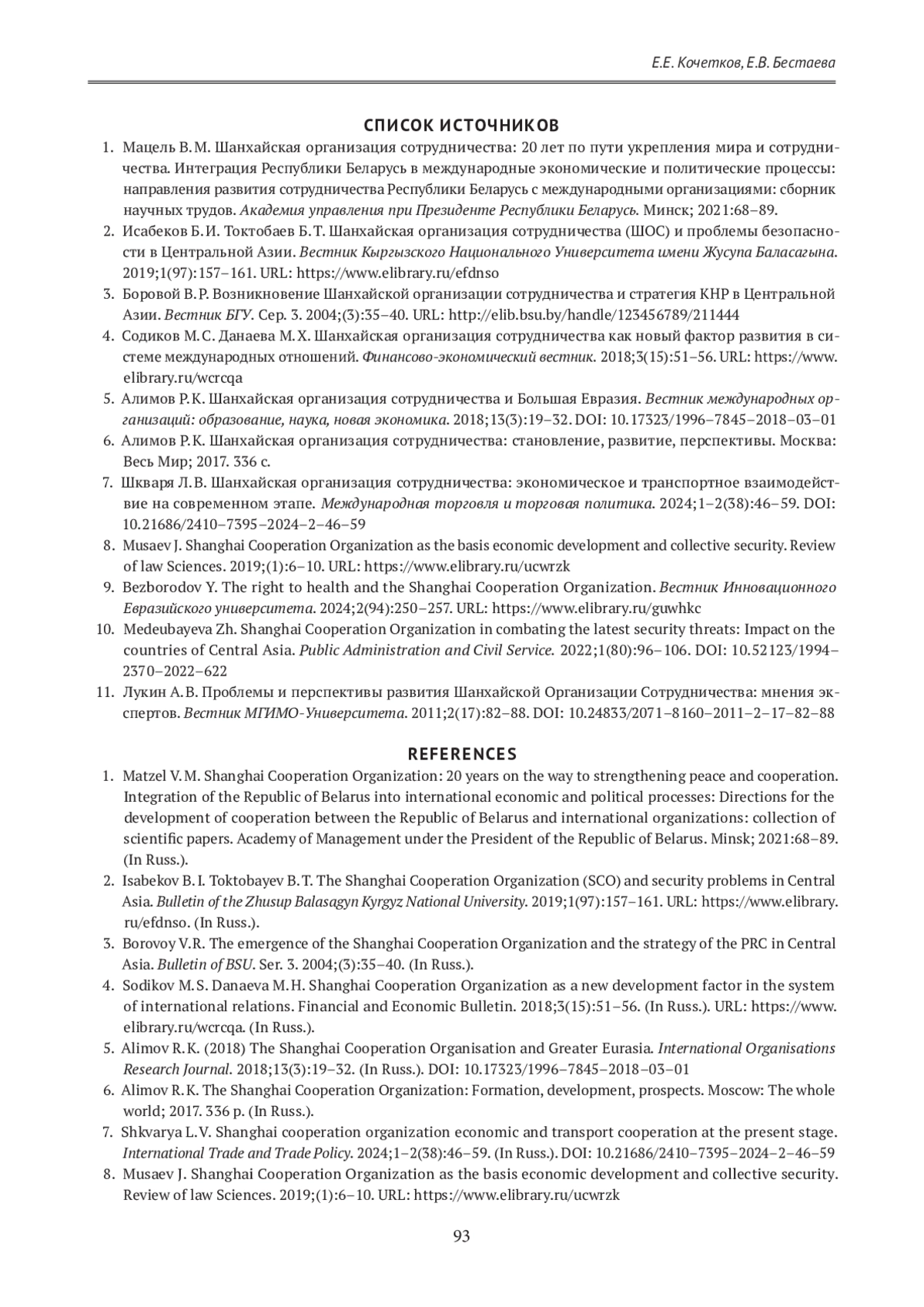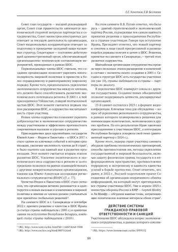 1. Мацель В. М. Шанхайская организация сотрудничества: 20 лет по пути укрепления мира и сотрудничества. Интеграция Республики Беларусь в международные экономические и политические процессы: направления развития сотрудничества Республики Беларусь с международными организациями: сборник научных трудов. Академия управления при Президенте Республики Беларусь. Минск; 2021:68-89.