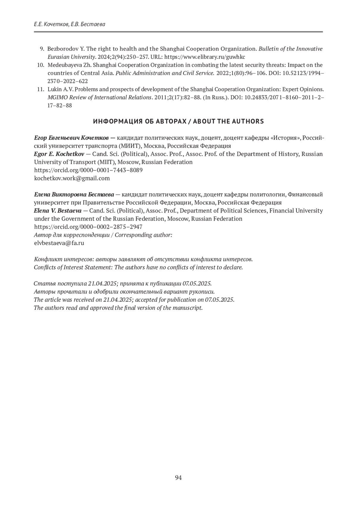10. Medeubayeva Zh. Shanghai Cooperation Organization in combating the latest security threats: Impact on the countries of Central Asia. Public Administration and Civil Service. 2022;1(80):96-106. https://doi.org/10.52123/1994-2370-2022-622